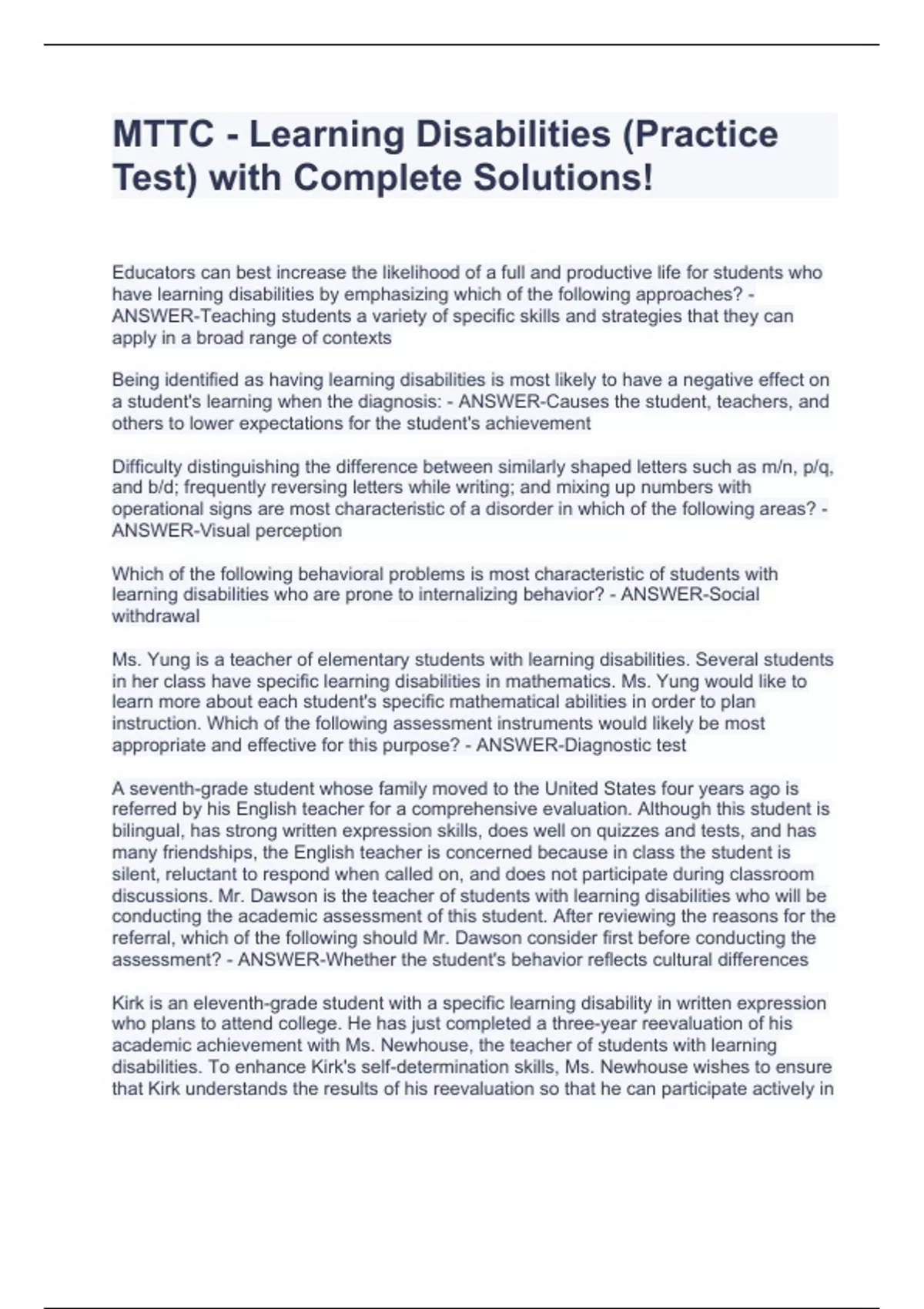 mttc learning disabilities stuvia