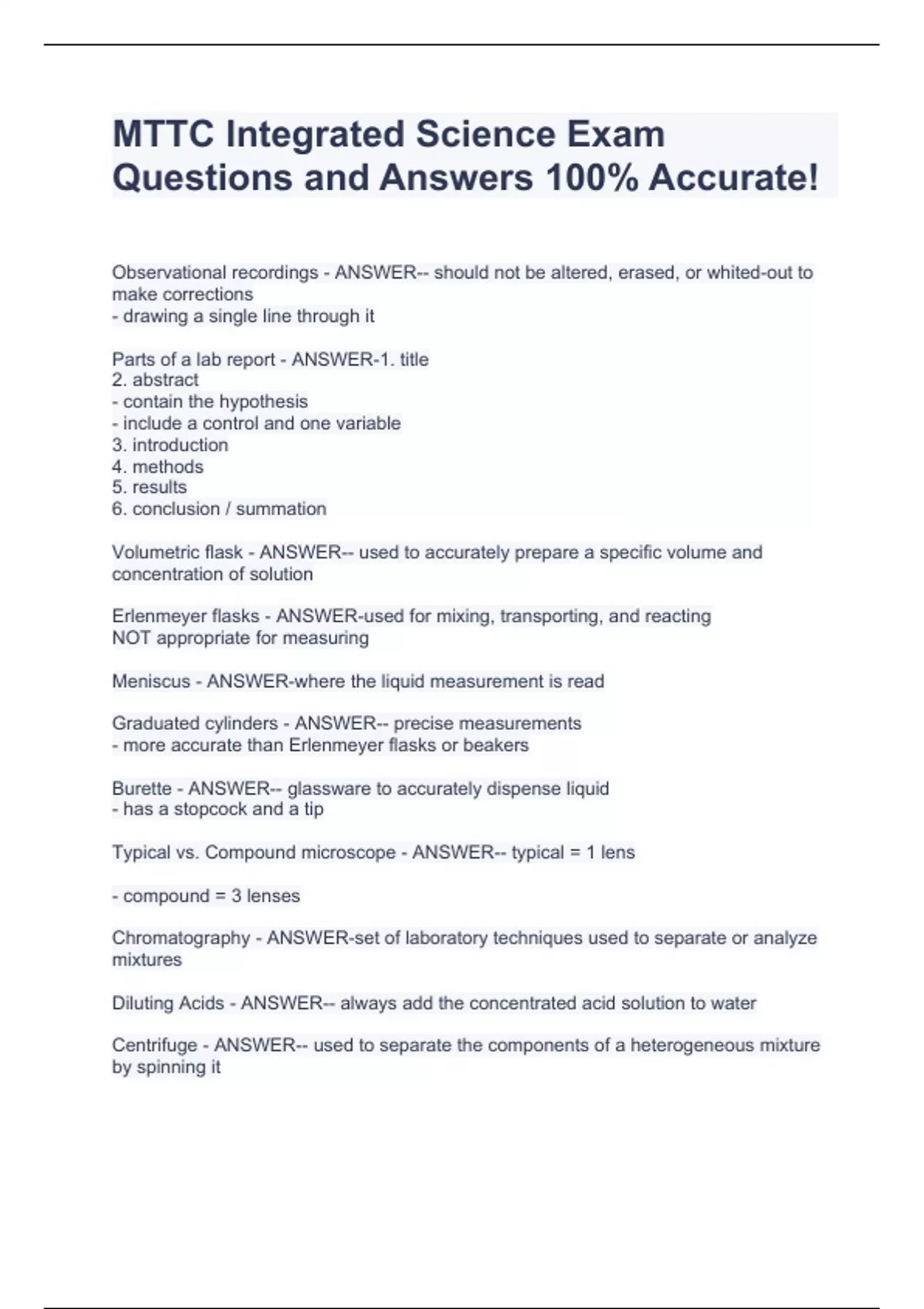 Observational recordings - ANSWER-- should not be altered, erased, or whited-out to make corrections - drawing a single line through it Parts of a lab report - ANSWER-1. title 2. abstract - contain the hypothesis - include a control and one variable 3. introduction 4. methods 5. results 6. conclusion / summation Volumetric flask - ANSWER-- used to accurately prepare a specific volume and concentration of solution Erlenmeyer flasks - ANSWER-used for mixing, transporting, and reacting NOT appropriate for measuring Meniscus - ANSWER-where the liquid measurement is read Graduated cylinders - ANSWER-- precise measurements - more accurate than Erlenmeyer flasks or beakers Burette - ANSWER-- glassware to accurately dispense liquid - has a stopcock and a tip Typical vs. Compound microscope - ANSWER-- typical = 1 lens - compound = 3 lenses Chromatography - ANSWER-set of laboratory techniques used to separate or analyze mixtures Diluting Acids - ANSWER-- always add the concentrated acid solution to water Centrifuge - ANSWER-- used to separate the components of a heterogeneous mixture by spinning it ex. separate blood cells and plasma - the heavier cells settle on the bottom of the test tube and the lighter plasma stays on top ex. salad spinner to dry lettuce Calorimetry - ANSWER-used to determine the heat released or absorbed in a chemical reaction Titration - ANSWER-helps determine the precise endpoint of a reaction Metric system - ANSWER-- meter: length - liter = volume - gram = mass Graphs of independent vs dependent variable - ANSWER-*independent variable = what is being manipulated is on the x-axis *dependent variable = the ones that may change as the independent variable changes is on the y-axis 5 skills developed from the National Science Education Standards - ANSWER-1. understand scientific concepts 2. appreciat