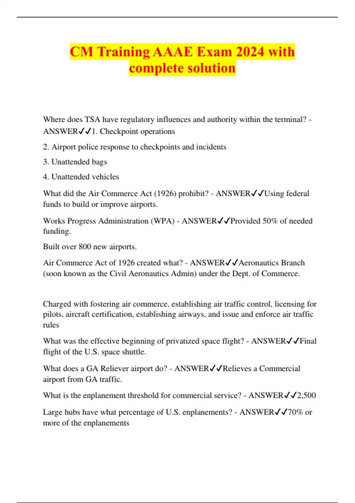 CM Training AAAE Exam 2024 with complete solution Where does TSA have regulatory influences and authority within the terminal? - ANSWER1. Checkpoint operations 2. Airport police response to checkpoints and incidents 3. Unattended bags 4. Unattended vehicles What did the Air Commerce Act (1926) prohibit? - ANSWERUsing federal funds to build or improve airports. Works Progress Administration (WPA) - ANSWERProvided 50% of needed funding. Built over 800 new airports. Air Commerce Act of 1926 created what? - ANSWERAeronautics Branch (soon known as the Civil Aeronautics Admin) under the Dept. of Commerce. Charged with fostering air commerce, establishing air traffic control, licensing for pilots, aircraft certification, establishing airways, and issue and enforce air traffic rules What was the effective beginning of privatized space flight? - ANSWERFinal flight of the U.S. space shuttle. What does a GA Reliever airport do? - ANSWERRelieves a Commercial airport from GA traffic. What is the enplanement threshold for commercial service? - ANSWER2,500 Large hubs have what percentage of U.S. enplanements? - ANSWER70% or more of the enplanements What are the cloud ceiling and visibility requirements for Visual Flight Rules? - ANSWERCloud ceiling: 1,000' Visibility requirements: 3 miles "1000 and 3" What is the entity who is responsible for airport governance? - ANSWERThe Airport Sponsor. What is the most common airport ownership type in the U.S.? - ANSWERMunicipalities (cities and counties) Who sets standards for security access control systems? - ANSWERThe Radio Technical Commission on Aeronautics How many days are required for the Notice of Proposed Rule-Making? - ANSWER30 days What is the directive to FAA personnel on specific subjects and programs? - ANSWERThe FAA Order What is the method the FAA has found to be the best to extend federal policy to local government units? - ANSWERGrant Assurances What is 14 CFR Part 13 Investigation and Enforcement - ANSWERThe informal complaint system that is filed with the Airport District Office. FAA will investigate and offer to help resolve. If the sponsor is in violation, the FAA provides the opportunity to comply. A Notice of Noncompliance may be issued if the FAA believes the airport is non- compliant. The letter will identify the apparent violation(s), specifies corrective action(s), and gives a deadline. What is 14 CFR Part 16 Rules of Practice for Federally-Assisted Airport Enforcement Proceedings - ANSWERThe formal complaint system that is filed in Washington DC. It involves financial compliance and reasonable and nondiscriminatory access, but includes all obligations in the Grant Assurances and property deeds. Formal agency finding regarding the compliance status of an airport. Prior to a Part 16 complaint, a person must have initiated and engaged in good faith efforts to resolve informally (Part 13 will work). Deadline driven, including pleadings, investigations, and lawyers If airport is non-compliant, FAA may withhold new grants, withhold payment on existing grants, terminate eligibility for future grants and passenger facility charges; cease and desist orders; civil penalties; or judicial enforcement. What does the Tucker Act do? - ANSWERWaives immunity over claims arising out of contracts with the federal government. What agency has the power to make safety related regulations after an aircraft accident? - ANSWERThe FAA Who produces standards and recommended practices for aviation worldwide? - ANSWERThe International Civil Aviation Organization (ICAO) What professional industry trade organization represents GA pilots of small aircraft? - ANSWERAircraft Owners & Pilots Association What does Grant Assurance #21 (Compatible Land Use) ensure? - ANSWERThe sponsor must make a reasonable attempt at compatible land use outside airport property boundaries. Incompatible land is generally residential, schools, hospitals or public health entities, and concert halls. What document must always be up to date to receive FAA funds? - ANSWERALP The ALP must delineate the airport boundaries, all facilities, and identify future development plans. FAA approval represents concurrence in the conformity of design standards and criteria. According to the FAA, where do most conflicts occur in permitted activities (aero or non-aero)? - ANSWERNon-aeronautical What are airport tenants and users required to adhere to? - ANSWERRules and Regulations What is the benefit of grant assurances to the airport user? - ANSWEREnsures adequate level of safe and effective se