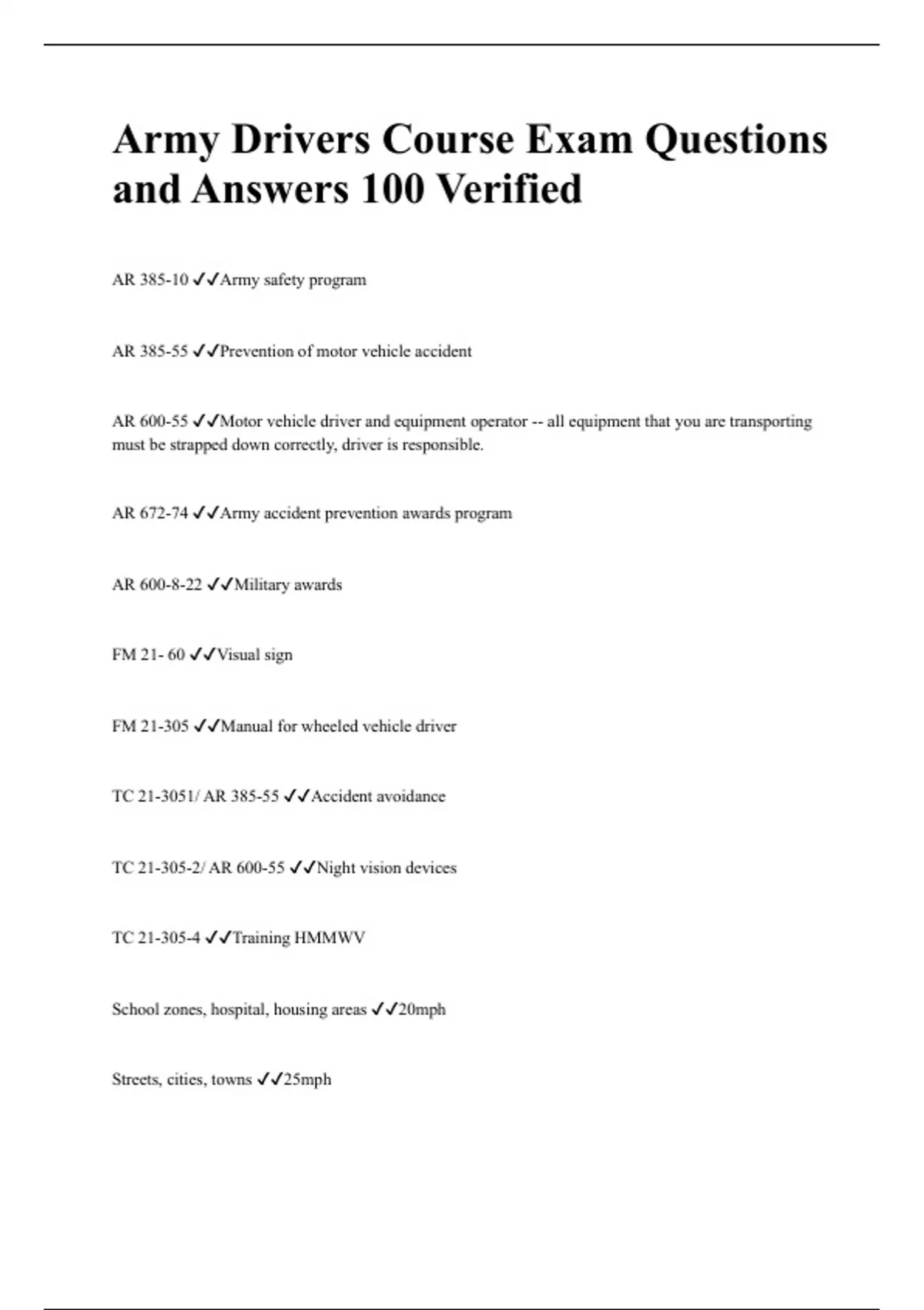 Army Drivers Course Exam Questions and Answers 100 Verified AR 385-10 Army safety program AR 385-55 Prevention of motor vehicle accident AR 600-55 Motor vehicle driver and equipment operator -- all equipment that you are transporting must be strapped down correctly, driver is responsible. AR 672-74 Army accident prevention awards program AR 600-8-22 Military awards FM 21- 60 Visual sign FM 21-305 Manual for wheeled vehicle driver TC 21-3051/ AR 385-55 Accident avoidance TC 21-305-2/ AR 600-55 Night vision devices TC 21-305-4 Training HMMWV School zones, hospital, housing areas 20mph Streets, cities, towns 25mph