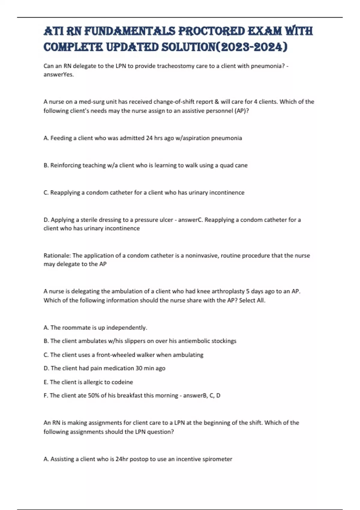 Can an RN delegate to the LPN to provide tracheostomy care to a client with pneumonia? - answerYes. A nurse on a med-surg unit has received change-of-shift report & will care for 4 clients. Which of the following client's needs may the nurse assign to an assistive personnel (AP)? A. Feeding a client who was admitted 24 hrs ago w/aspiration pneumonia B. Reinforcing teaching w/a client who is learning to walk using a quad cane C. Reapplying a condom catheter for a client who has urinary incontinence D. Applying a sterile dressing to a pressure ulcer - answerC. Reapplying a condom catheter for a client who has urinary incontinence Rationale: The application of a condom catheter is a noninvasive, routine procedure that the nurse may delegate to the AP A nurse is delegating the ambulation of a client who had knee arthroplasty 5 days ago to an AP. Which of the following information should the nurse share with the AP? Select All. A. The roommate is up independently. B. The client ambulates w/his slippers on over his antiembolic stockings C. The client uses a front-wheeled walker when ambulating D. The client had pain medica