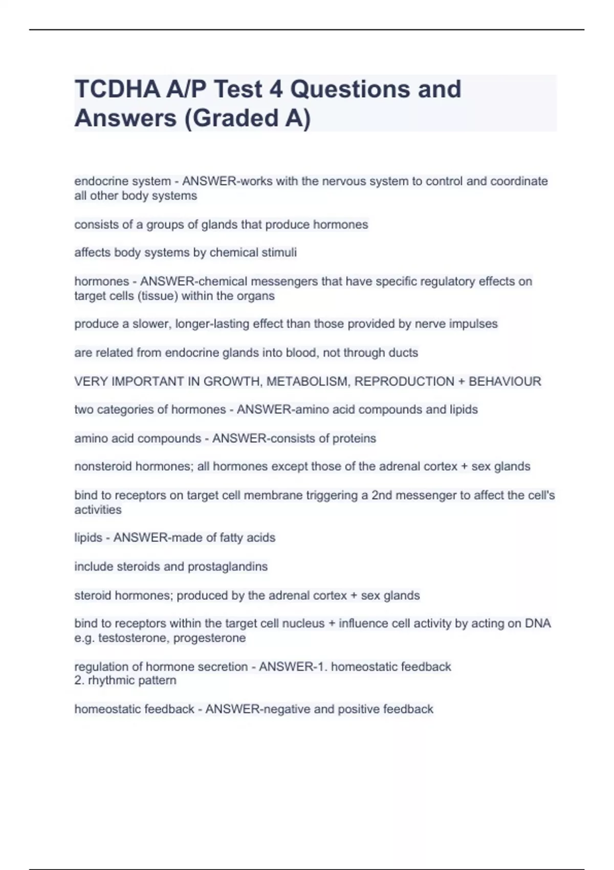 TCDHA A/P Test 4 Questions and Answers (Graded A) TCDHA A/P Test 4 Questions and Answers (Graded A) TCDHA A/P Test 4 Questions and Answers (Graded A) TCDHA A/P Test 4 Questions and Answers (Graded A) endocrine system - ANSWER-works with the nervous system to control and coordinate all other body systems consists of a groups of glands that produce hormones affects body systems by chemical stimuli