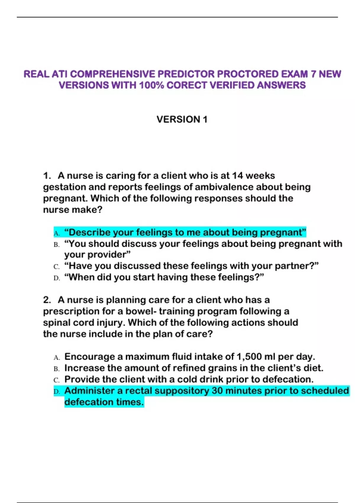 REAL ATI COMPREHENSIVE PREDICTOR PROCTORED EXAM 7 NEW VERSIONS WITH 100% CORECT VERIFIED ANSWERS VERSION 1 1. A nurse is caring for a client who is at 14 weeks gestation and reports feelings of ambivalence about being pregnant. Which of the following responses should the nurse make? A. “Describe your feelings to me about being pregnant” B. “You should discuss your feelings about being pregnant with your provider” C. “Have you discussed these feelings with your partner?” D. “When did you start having these feelings?” 2. A nurse is planning care for a client who has a prescription for a bowel- training program following a spinal cord injury. Which of the following actions should the nurse include in the plan of care? A. Encourage a maximum fluid intake of 1,500 ml per day. B. Increase the amount of refined grains in the client’s diet. C. Provide the client with a cold drink prior to defecation. D. Administer a rectal suppository 30 minutes prior to scheduled defecation times. 3. A nurse is caring for a client who is in active labor and requests pain management. Which of the following actions should the nurse take? A. Administer ondansetron. B. Place the client in a warm shower. C. Apply fundal pressure during contractions. D. Assist the client to a supine position. 4. a nurse in an emergency department is performing triage for multiple clients following a disaster in the community. To which of the following types of injuries should the nurse assign the highest priority? A. Below-the knee amputation B. Fractured tibia C. 95% full-thickness body burn D. 10cm (4in) laceration to the forearm 5. a nurse manager is updating protocols for the use of belt restraints. Which of the following guidelines should the nurse include? A. Remove the client’s restraint every 4hr B. Document the client’s condition every 15 min C. Attach the restrain to the bed’s side rails D. Request a PRN restrain prescription for clients who are aggressive 6. 7. A nurse in a pediatric unit is preparing to insert an IV catheter for 7-year-old. Which of the following actions should the nurse take? A. (Unable to read) B. Tell the child they will feel discomfort during the catheter insertion. C. Use a mummy restraint to hold the child during the catheter insertion. D. Require the parents to leave the room during the procedure. 8. A nurse is caring for a client who has arteriovenous fistula Which of the following findings should the nurse report? A. Thrill upon palpation. B. Absence of a bruit. C. Distended blood vessels D. Swishing sound upon auscultation. 9. A nurse is providing discharge teaching for a client who has an implantable cardioverter defibrillator which of the following statements demonstrates understanding of the teaching? A. “I will soak in the tub rather and showering” B. “I will wear loose clothing around my ICD” C. “I will stop using my microwave oven at home because of my ICD” D. “I can hold my cellphone on the same side of my body as the ICD” 10.A nurse is teaching an in-service about nursing leadership. Which of the following information should the nurse include about an effective leader? A. Acts as an advocate for the nursing unit. B. (Unable to read) for the unit C. Priorities staff request over client needs. D. Provides routine client care and documentation. 11.A nurse is reviewing the laboratory findings of a client who has diabetes mellitus and reports that she has been following her (unable to read) care. The nurse should identify which of the following findings indicates a need to revise the client’s plan of care. A. Serum sodium 144 mEq/ B. (Unable to read) C. Hba1c 10 % D. Random serum glucose 190 mg/dl. 12.A nurse in a provider’s office is reviewing the laboratory results of a group of clients. The nurse should identify that which of the following sexually transmitted infections is a nationally notifiable infectious disease that should be reported to the state health department? A. Chlamydia B. Human papillomavirus C. Candidiasis D. Herps simplex virus 13.A nurse is teaching a newly licensed nurse about therapeutic techniques to use when leading a group on a mental health unit. Which of the following group facilitation techniques should the nurse include in the teaching? A. Share personal opinions to help influence the group’s values B. Measure the accomplishments of the group against a previous group C. Yield in situations of conflicts to maintain group harmony D. Use modeling to help the clients improve their interpersonal skills 14.A nurse is planning for a client who practices Orthodox Judaism. The client tells the nurse that (Unable to read) Passover holiday. Which of the following action should the nurse include in the plan of care? A. Provide chicken with cream sauce. B. Avoid serving fish with fins and scales. C. Provide unleavened bread. D. Avoid serving foods containing lamb. 15.A nurse is caring for a client who has a pulmonary embolism. The nurse should identify the effectiveness of the treatment A. A chest x-ray reveals increased density in all fields. B. The client reports feeling less anxious. C. Diminished breath sounds are auscultated bilaterally D. ABG results include Ph 7.48 PaO2 77 mm Hg and PaCO2 47 mm Hg. 16.A nurse in an emergency department is assessing a client who reports ingesting thirty diazepam tablets (Unable to read) a respiratory rate of 10/min. After securing the client’s airway and initiating an IV, which of the following actions should the nurse do next. A. Monitor the client’s IV site for thrombophlebitis. B. Administer flumazenil to the client. C. Evaluate the client for further suicidal behavior. D. Initiate seizure precautions for the client.