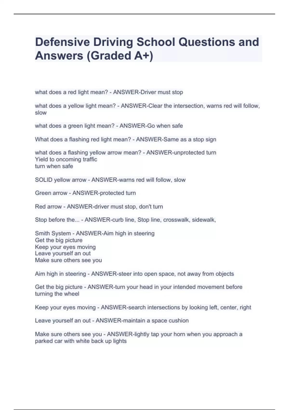 Defensive Driving School Questions and Answers (Graded A+) Defensive Driving School Questions and Answers (Graded A+) Defensive Driving School Questions and Answers (Graded A+)