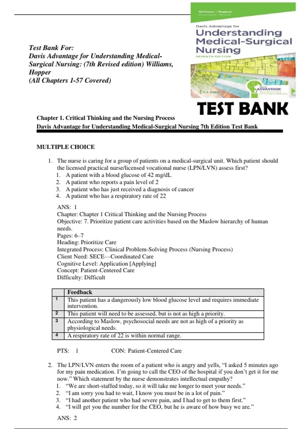 Test Bank For- Davis Advantage for Understanding Medical-Surgical Nursing: (7th Revised edition) Williams, Hopper