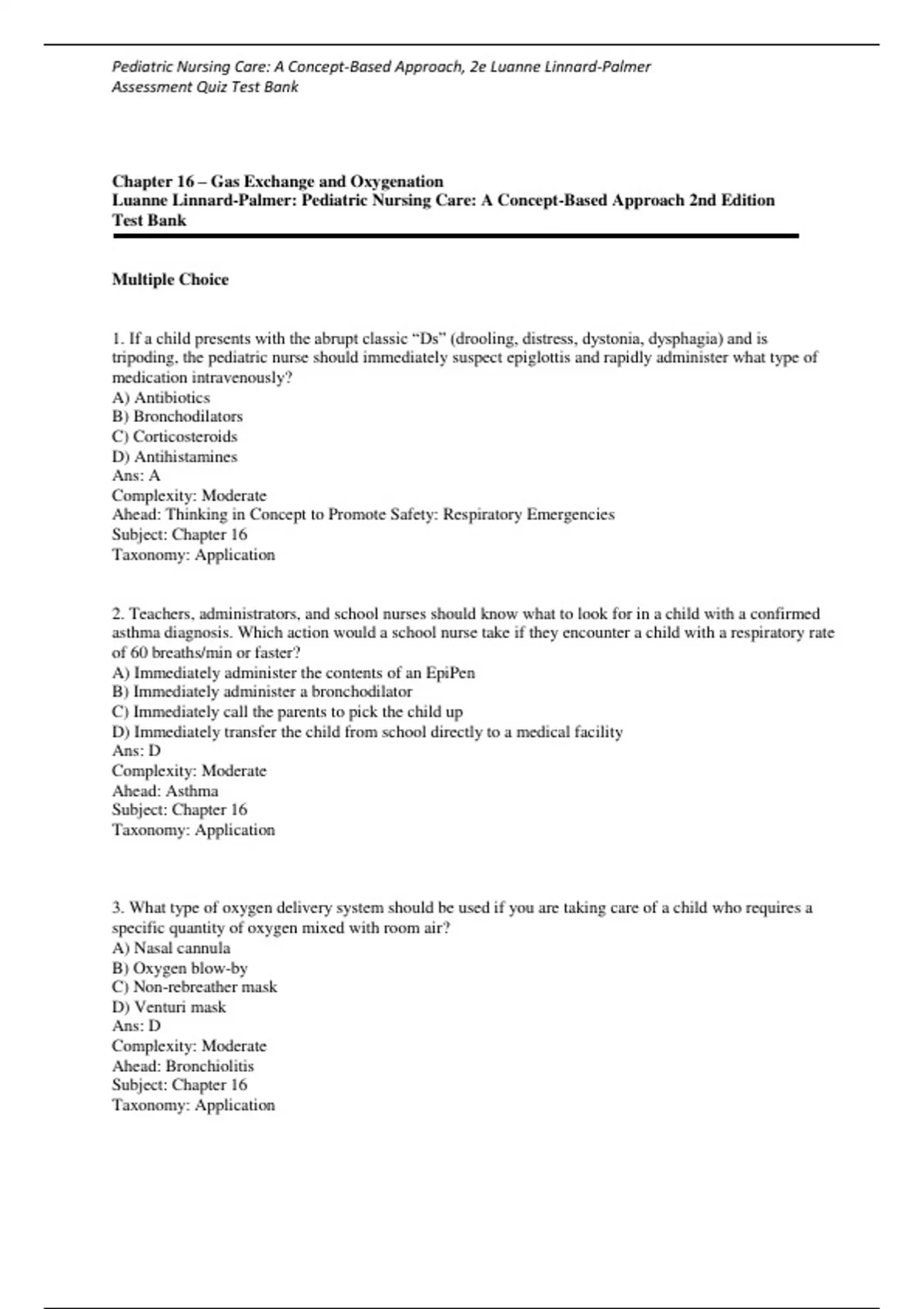 Assessment Quiz Chapter 16- Gas Exchange and Oxygenation Pediatric Nursing Care: A Concept-Based Approach, 2e Luanne Linnard-Palmer Test Bank