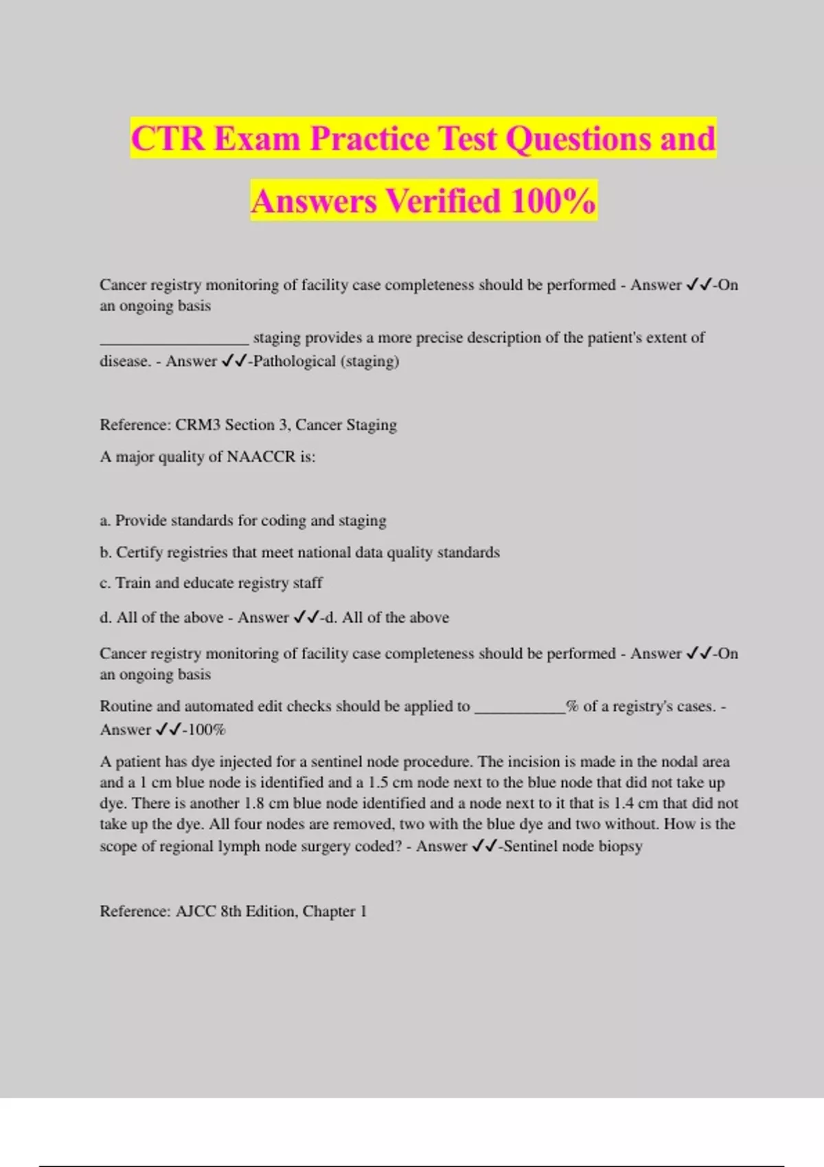 CTR Exam Practice Test Questions and Answers Verified 100% Cancer registry monitoring of facility case completeness should be performed - Answer ️️ -On an ongoing basis __________________ staging provides a more precise description of the patient's extent of disease. - Answer ️️ -Pathological (staging) Reference: CRM3 Section 3, Cancer Staging A major quality of NAACCR is: a. Provide standards for coding and staging b. Certify registries that meet national data quality standards c. Train and educate registry staff d. All of the above - Answer ️️ -d. All of the above Cancer registry monitoring of facility case completeness should be performed - Answer ️️ -On an ongoing basis Routine and automated edit checks should be applied to ___________% of a registry's cases. - Answer ️️ -100% A patient has dye injected for a sentinel node procedure. The incision is made in the nodal area and a 1 cm blue node is identified and a 1.5 cm node next to the blue node that did not take up dye. There is another 1.8 cm blue node identified and a node next to it that is 1.4 cm that did not take up the dye. All four nodes are removed, two with the blue dye and two without. How is the scope of regional lymph node surgery coded? - Answer ️️ -Sentinel node biopsy Reference: AJCC 8th Edition, Chapter 1 Sentinel node biopsy because removing additional abnormal nodes during the sentinel node procedure does not change this from being a sentinel node procedure. According to the CoC standard, the maximum number of cases to be evaluated, annually, are: - Answer ️️ -300 A major quality of NAACCR is: a. Provide standards for coding and staging b. Certify registries that meet national data quality standards c. Train and educate registry staff d. All of the above - Answer ️️ -d. All of the above The cancer committee monitors the program's Estimated Performance Rates (EPR) for all quality measures using.. - Answer ️️ -CP3R Clinical staging - Answer ️️ -Includes any information obtained about the extent of cancer before the start of definitive treatment. Reference: AJCC 8th Edition, Chapter 1 Routine and automated edit checks should be applied to ___________% of a registry's cases. - Answer ️️ -100% The diagnosis is "undifferentiated NK-cell leukemia." What is the grade/differentiation? - Answer ️️ -8