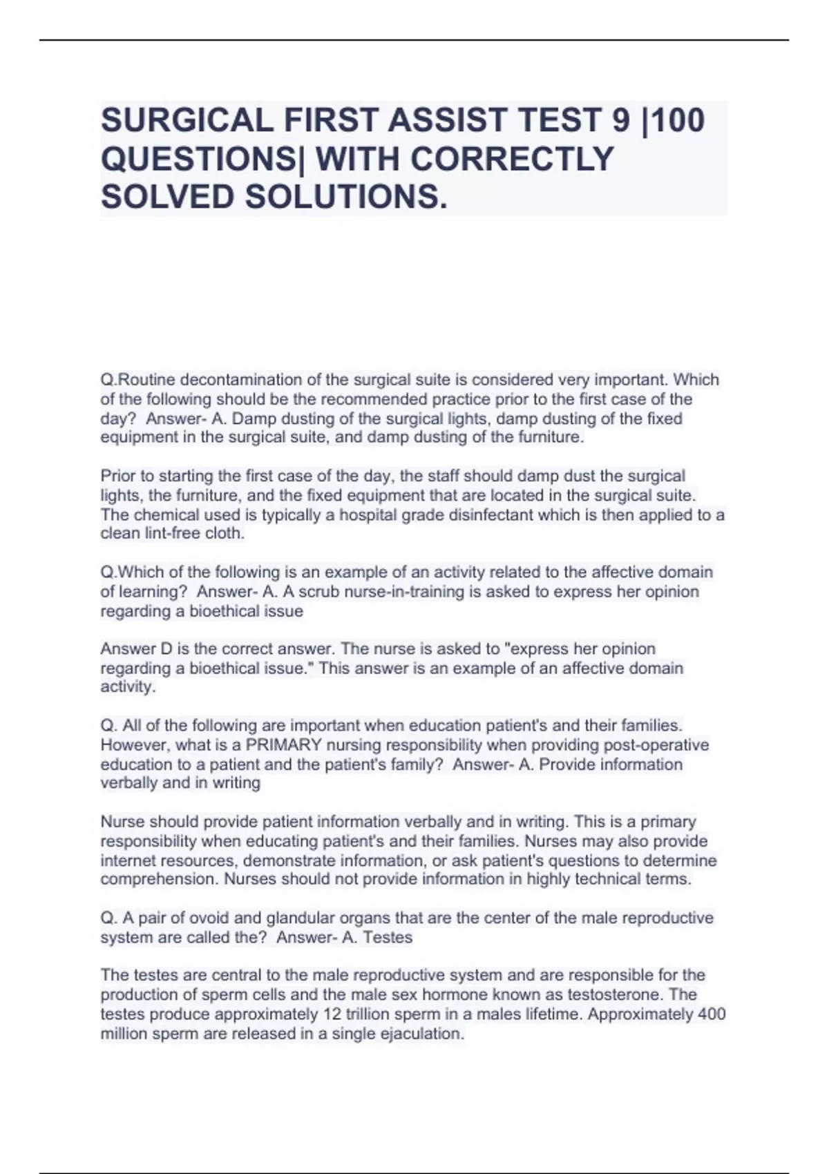 SURGICAL FIRST ASSIST TEST 9 |100 QUESTIONS| WITH CORRECTLY SOLVED SOLUTIONS.