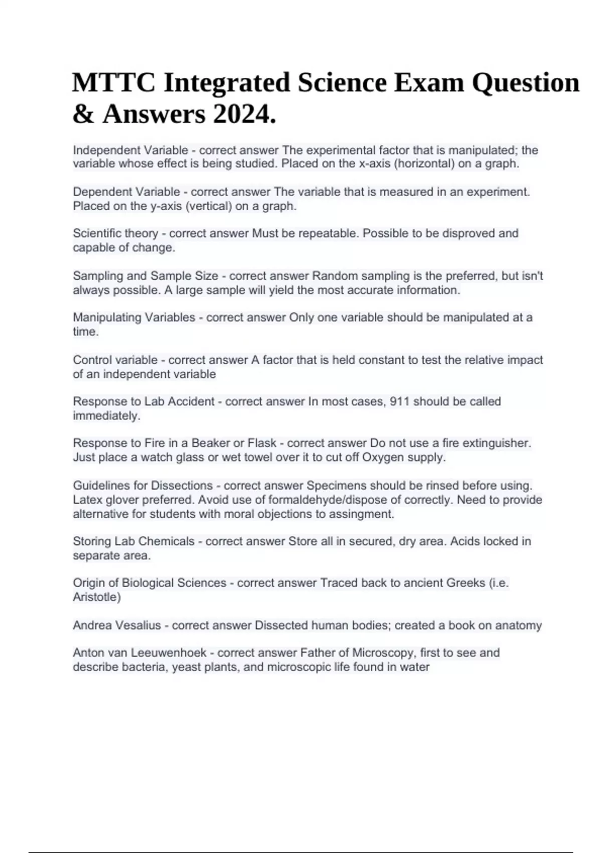 MTTC Integrated Science Exam Question & Answers 2024. Independent Variable - correct answer The experimental factor that is manipulated; the variable whose effect is being studied. Placed on the x-axis (horizontal) on a graph. Dependent Variable - correct answer The variable that is measured in an experiment. Placed on the y-axis (vertical) on a graph. Scientific theory - correct answer Must be repeatable. Possible to be disproved and capable of change. Sampling and Sample Size - correct answer Random sampling is the preferred, but isn't always possible. A large sample will yield the most accurate information. Manipulating Variables - correct answer Only one variable should be manipulated at a time. Control variable - correct answer A factor that is held constant to test the relative impact of an independent variable Response to Lab Accident - correct answer In most cases, 911 should be called immediately. Response to Fire in a Beaker or Flask - correct answer Do not use a fire extinguisher. Just place a watch glass or wet towel over it to cut off Oxygen supply. Guidelines for Dissections - correct answer Specimens should be rinsed before using. Latex glover preferred. Avoid use of formaldehyde/dispose of correctly. Need to provide alternative for students with moral objections to assingment. Storing Lab Chemicals - correct answer Store all in secured, dry area. Acids locked in separate area. Origin of Biological Sciences - correct answer Traced back to ancient Greeks (i.e. Aristotle) Andrea Vesalius - correct answer Dissected human bodies; created a book on anatomy Anton van Leeuwenhoek - correct answer Father of Microscopy, first to see and describe bacteria, yeast plants, and microscopic life found in water MTTC Integrated Science Exam Question & Answers 2024. Scanning Electron Microscope (SEM) - correct answer Instead of a light, a beam of electrons pass through specimen. Resolution about 1,000 times greater than light microscope. Will kill specimen though. Robert Hooke - correct answer Famous for Hook's law describing elasticity. But called a "virtuoso", able to contribute findings to any major field in science Carl Von Linnaeus - correct answer Famous for binomial system of nomenclature. Each living organism has two names, a genus and species. Considered father of modern ecology and taxonomy Pasteur - correct answer Discovered role of microorganisms in the cause of disease, pasteurization, and rabies vaccine. Koch's Postulates - correct answer Specific diseases caused by specific pathogens Cell theory - correct answer Cell is the common structural unit in plants and animals. Proposed by Mattias Scheleiden and Schwann. Watson and Crick - correct answer Discovered the structure of DNA was a double helix (in the 1950s). Made it possible to understand how DNA replicated and synthesized proteins Commonalities Among all Sciences - correct answer - Systems, order, and organization - Evidence, models, and explanation - Constancy, change, and measurement - Evolution and equilibrium - Form and function Empirical Evidence - correct answer All evidence is empirical; all evidence must be observed by the five sense. Peer-reviewed Journals - correct answer Most accepted source for information on scientific experiments and studies Air Pollution - correct answer Chemicals in the air; include carbon monoxide, sulfur dioxide, and chlorofluorocarbons (CFC's) Water Pollution - correct answer Contaminants enter water by ground runoff or by leaching Thermal pollution - correct answer Factories dump water at high temperatures which increases normal water temperatures. This means the water can hold less gas, disrupting the ecosystem Greenhouse gasses - correct answer I.e. carbon dioxide and nitrous oxide. Concentration of them is increased by burning fossil fuels. These gasses absorb and trap heat, therefore warming the planet Acid ran - correct answer Sulfur and nitrous oxides converted to acids and contaminate water supplies Prokaryotes - correct answer Single-celled organisms that do not have a membranebound nucleus Flagella - correct answer Appendages on bacteria cells; used for movement Pili - correct answer Used by bacteria cells to attach to other cells Cell Wall - correct answer a thin membrane around the cytoplasm of a cell Cell membrane - correct answer a phospholipid layer that covers a cell's surface and acts as a barrier between the inside of a cell and the cell's environment Eukaryotes - correct answer organisms whose cells contain a nucleus and other membrane bound organelles Nucleus - correct answer a part of the cell containing DNA and RNA and responsible for growth and reproduction Nucleolus - correct answer The organelle where ribosomes are made, synthesized and partially assembled, located in the nucleus Ribosomes - correct answer site of protein synthesis Endoplasmic Reticulum - correct answer an internal membrane system in which components of cell membrane and some proteins are constructed Golgi apparatus - correct answer stack of membranes in the cell that modifies, sorts, and packages proteins from the endoplasmic reticulum .