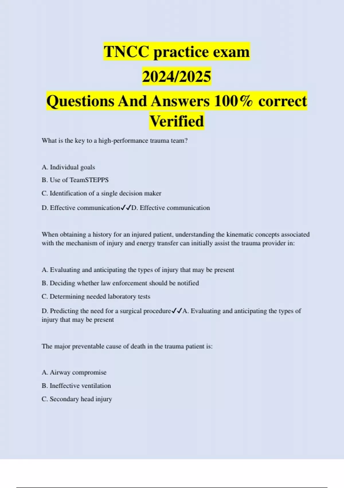 TNCC practice exam 2024/2025 Questions And Answers 100% correct Verified