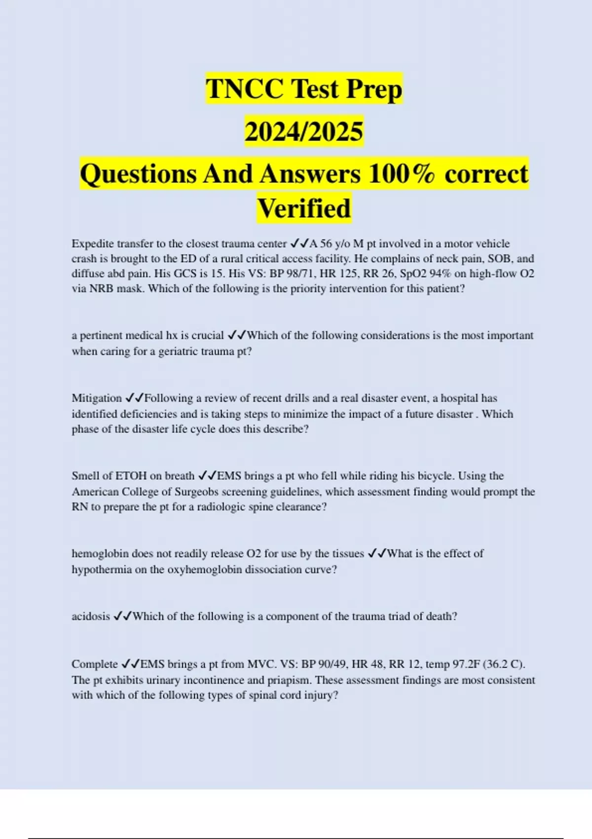 TNCC Test Prep 2024/2025 Questions And Answers 100% correct Verified