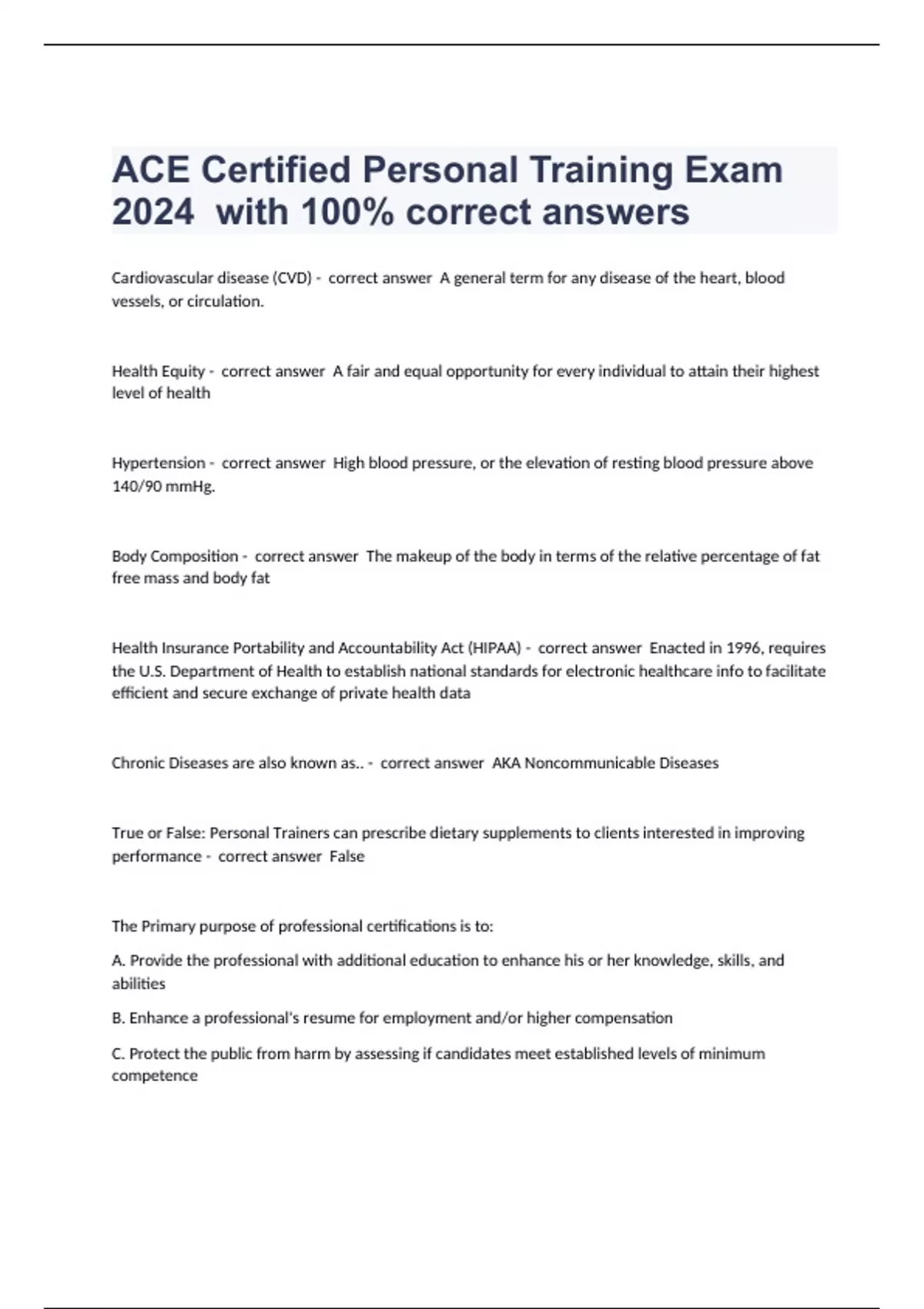 Cardiovascular disease (CVD) - correct answer A general term for any disease of the heart, blood vessels, or circulation. Health Equity - correct answer A fair and equal opportunity for every individual to attain their highest level of health Hypertension - correct answer High blood pressure, or the elevation of resting blood pressure above 140/90 mmHg. Body Composition - correct answer The makeup of the body in terms of the relative percentage of fat free mass and body fat Health Insurance Portability and Accountability Act (HIPAA) - correct answer Enacted in 1996, requires the U.S. Department of Health to establish national standards for electronic healthcare info to facilitate efficient and secure exchange of private health data Chronic Diseases are also known as.. - correct answer AKA Noncommunicable Diseases True or False: Personal Trainers can prescribe dietary supplements to clients interested in improving performance - correct answer False The Primary purpose of professional certifications is to: A. Provide the professional with additional education to enhance his or her knowledge, skills, and abilities B. Enhance a professional's resume for employment and/or higher compensation C. Protect the public from harm by assessing if candidates meet established levels of minimum competence