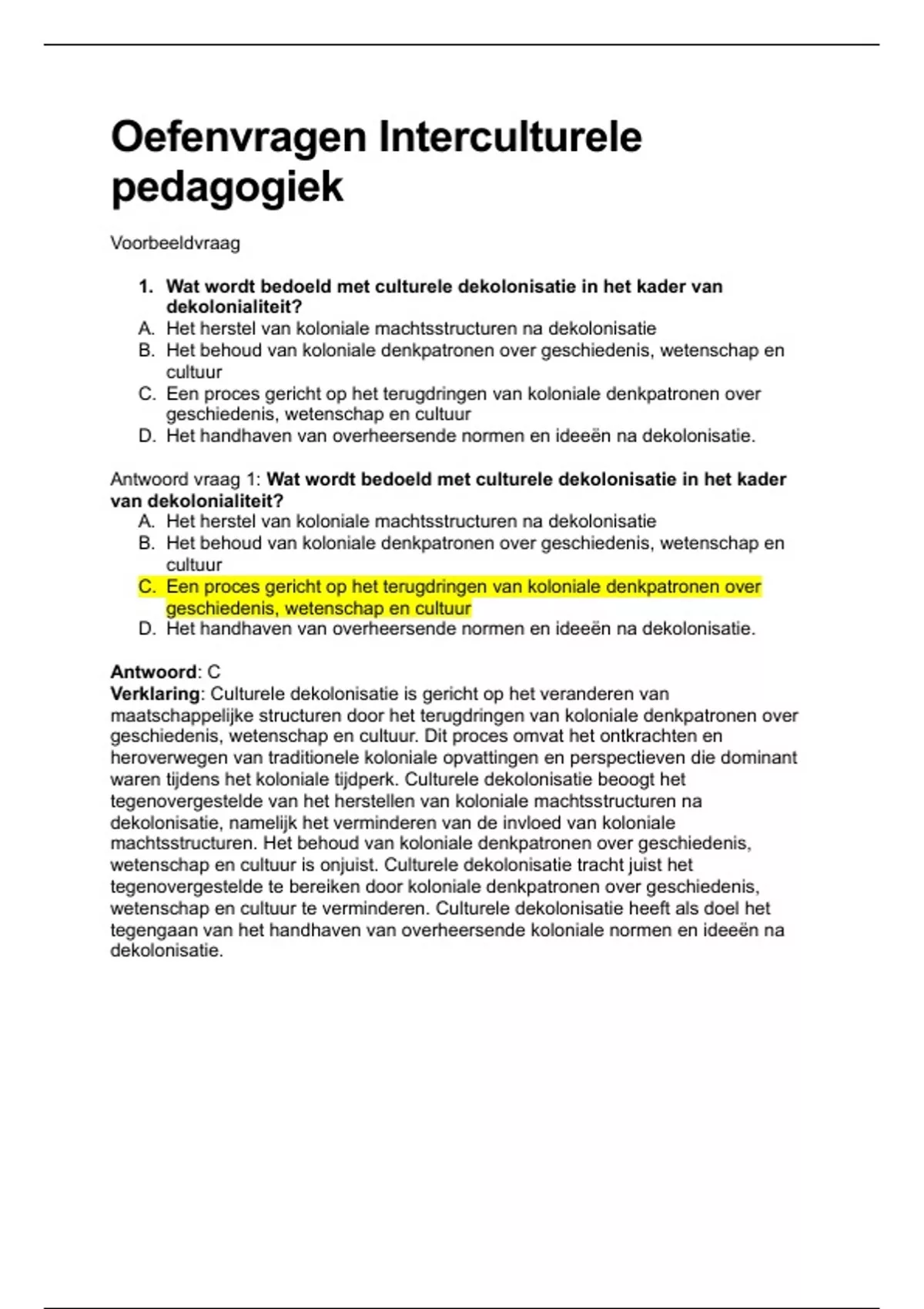 Deze oefentoets is bedoeld voor studenten die de opleiding Pedagogische wetenschappen/acpa volgen aan Universiteit Leiden en in het 1e leerjaar zitten. Het bevat 25 vragen over de stof (die lijken op de vragen uit het tentamen) die wordt getoetst voor het vak interculturele pedagogiek. Naast de antwoorden op de vragen, wordt er beschreven waarom het antwoord juist is.