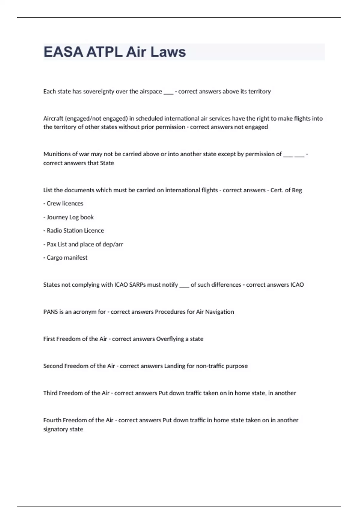 EASA ATPL Air LawsEach state has sovereignty over the airspace ___ - correct answers above its territory Aircraft (engaged/not engaged) in scheduled international air services have the right to make flights into the territory of other states without prior permission - correct answers not engaged Munitions of war may not be carried above or into another state except by permission of ___ ___ - correct answers that State List the documents which must be carried on international flights - correct answers - Cert. of Reg - Crew licences - Journey Log book - Radio Station Licence - Pax List and place of dep/arr - Cargo manifest States not complying with ICAO SARPs must notify ___ of such differences - correct answers ICAO PANS is an acronym for - correct answers Procedures for Air Navigation First Freedom of the Air - correct answers Overflying a state Second Freedom of the Air - correct answers Landing for non-traffic purpose Third Freedom of the Air - correct answers Put down traffic taken on in home state, in another Fourth Freedom of the Air - correct answers Put down traffic in home state taken on in another signatory state