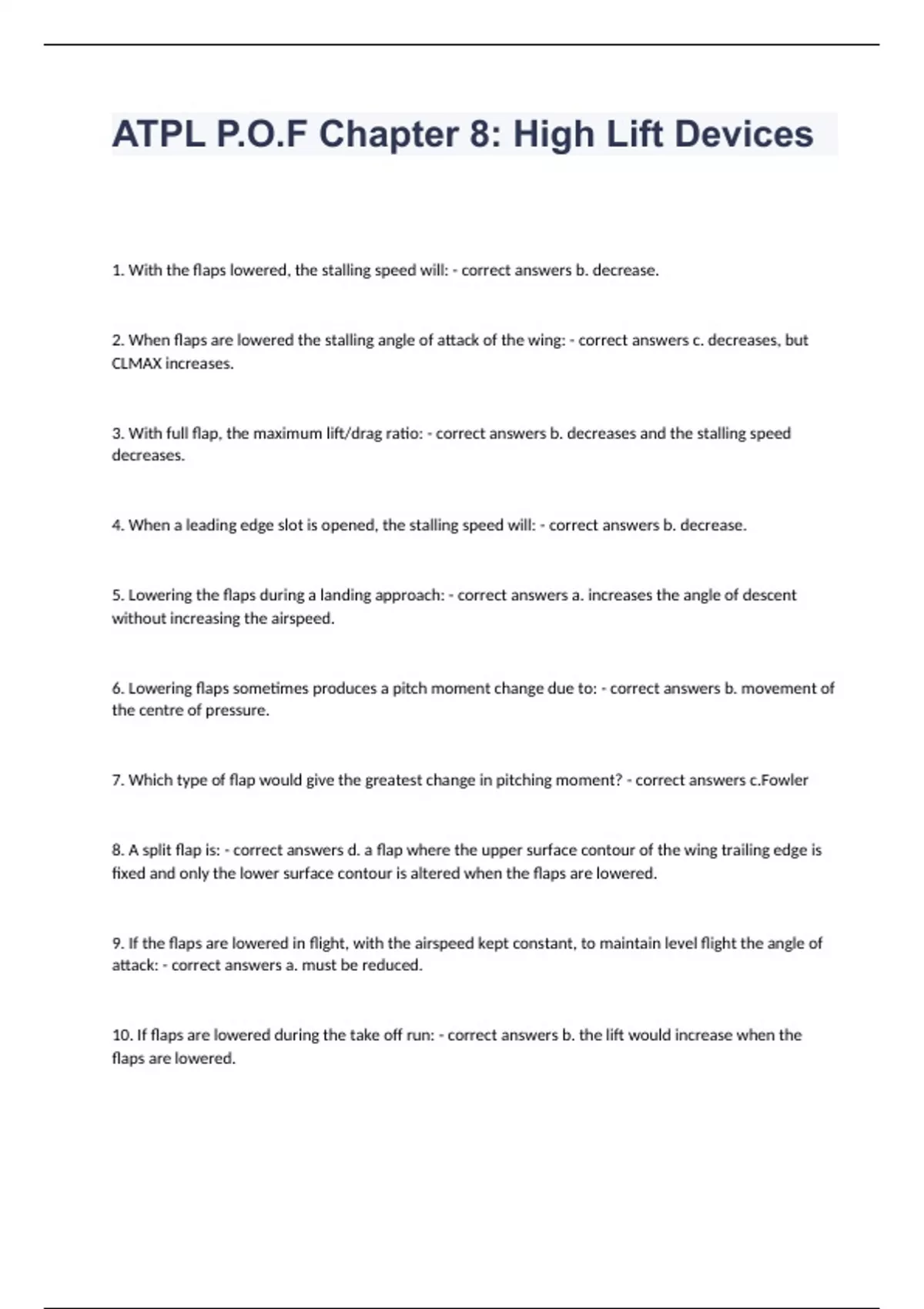 ATPL P.O.F Chapter 8: High Lift Devices 1. With the flaps lowered, the stalling speed will: - correct answers b. decrease. 2. When flaps are lowered the stalling angle of attack of the wing: - correct answers c. decreases, but CLMAX increases. 3. With full flap, the maximum lift/drag ratio: - correct answers b. decreases and the stalling speed decreases. 4. When a leading edge slot is opened, the stalling speed will: - correct answers b. decrease. 5. Lowering the flaps during a landing approach: - correct answers a. increases the angle of descent without increasing the airspeed. 6. Lowering flaps sometimes produces a pitch moment change due to: - correct answers b. movement of the centre of pressure. 7. Which type of flap would give the greatest change in pitching moment? - correct answers c.Fowler 8. A split flap is: - correct answers d. a flap where the upper surface contour of the wing trailing edge is fixed and only the lower surface contour is altered when the flaps are lowered. 9. If the flaps are lowered in flight, with the airspeed kept constant, to maintain level flight the angle of attack: - correct answers a. must be reduced. 10. If flaps are lowered during the take off run: - correct answers b. the lift would increase when the flaps are lowered. 11. When flaps are lowered the spanwise flow on the upper surface of the wing: - correct answers c. increases towards the root. 12. If a landing is to be made without flaps, the landing speed must be: - correct answers b. increased. 13. With reference to Annex A , the type of flap illustrated is a: - correct answers d. slotted Fowler flap. 14. With reference to Annex B , the type of flap illustrated is a: - correct answers d. variable camber flap.