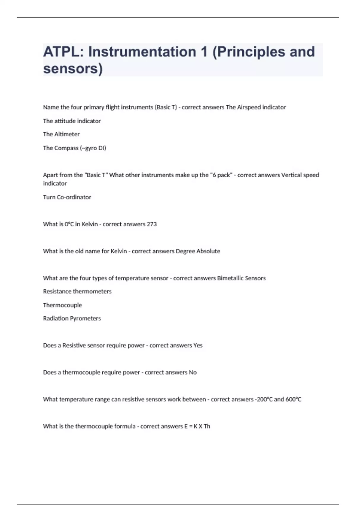 ATPL: Instrumentation 1 (Principles and sensors)Name the four primary flight instruments (Basic T) - correct answers The Airspeed indicator The attitude indicator The Altimeter The Compass (~gyro DI) Apart from the "Basic T" What other instruments make up the "6 pack" - correct answers Vertical speed indicator Turn Co-ordinator What is 0°C in Kelvin - correct answers 273 What is the old name for Kelvin - correct answers Degree Absolute What are the four types of temperature sensor - correct answers Bimetallic Sensors Resistance thermometers Thermocouple Radiation Pyrometers Does a Resistive sensor require power - correct answers Yes Does a thermocouple require power - correct answers No What temperature range can resistive sensors work between - correct answers -200°C and 600°C What is the thermocouple formula - correct answers E = K X Th