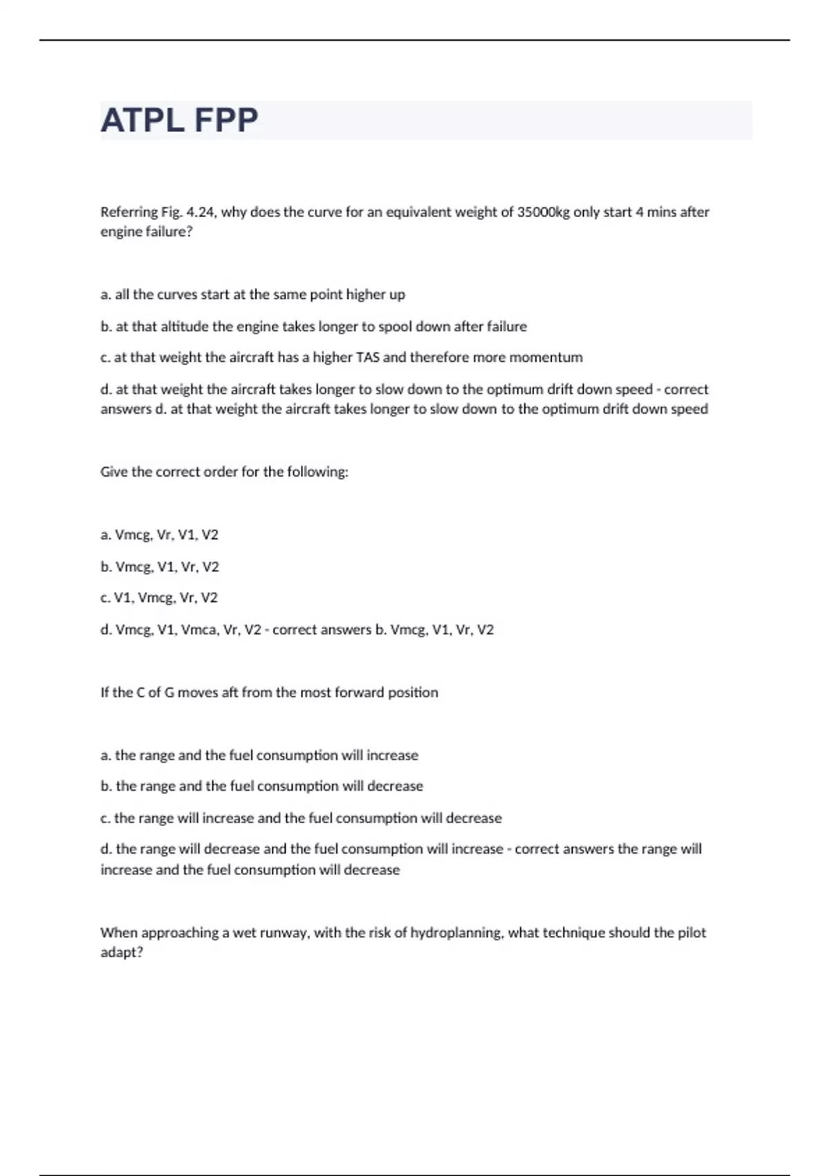 ATPL FPP Referring Fig. 4.24, why does the curve for an equivalent weight of 35000kg only start 4 mins after engine failure? a. all the curves start at the same point higher up b. at that altitude the engine takes longer to spool down after failure c. at that weight the aircraft has a higher TAS and therefore more momentum d. at that weight the aircraft takes longer to slow down to the optimum drift down speed - correct answers d. at that weight the aircraft takes longer to slow down to the optimum drift down speed Give the correct order for the following: a. Vmcg, Vr, V1, V2 b. Vmcg, V1, Vr, V2 c. V1, Vmcg, Vr, V2 d. Vmcg, V1, Vmca, Vr, V2 - correct answers b. Vmcg, V1, Vr, V2 If the C of G moves aft from the most forward position a. the range and the fuel consumption will increase b. the range and the fuel consumption will decrease c. the range will increase and the fuel consumption will decrease d. the range will decrease and the fuel consumption will increase - correct answers the range will increase and the fuel consumption will decrease When approaching a wet runway, with the risk of hydroplanning, what technique should the pilot adapt?