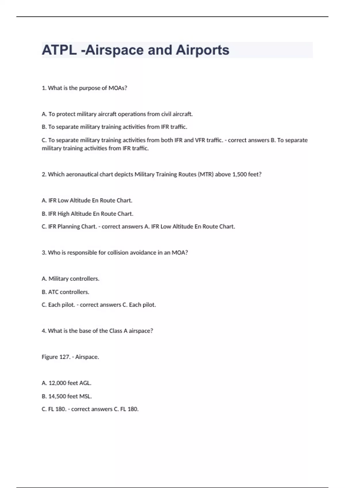 ATPL -Airspace and Airports1. What is the purpose of MOAs? A. To protect military aircraft operations from civil aircraft. B. To separate military training activities from IFR traffic. C. To separate military training activities from both IFR and VFR traffic. - correct answers B. To separate military training activities from IFR traffic. 2. Which aeronautical chart depicts Military Training Routes (MTR) above 1,500 feet? A. IFR Low Altitude En Route Chart. B. IFR High Altitude En Route Chart. C. IFR Planning Chart. - correct answers A. IFR Low Altitude En Route Chart. 3. Who is responsible for collision avoidance in an MOA? A. Military controllers. B. ATC controllers. C. Each pilot. - correct answers C. Each pilot. 4. What is the base of the Class A airspace? Figure 127. - Airspace. A. 12,000 feet AGL. B. 14,500 feet MSL. C. FL 180. - correct answers C. FL 180.