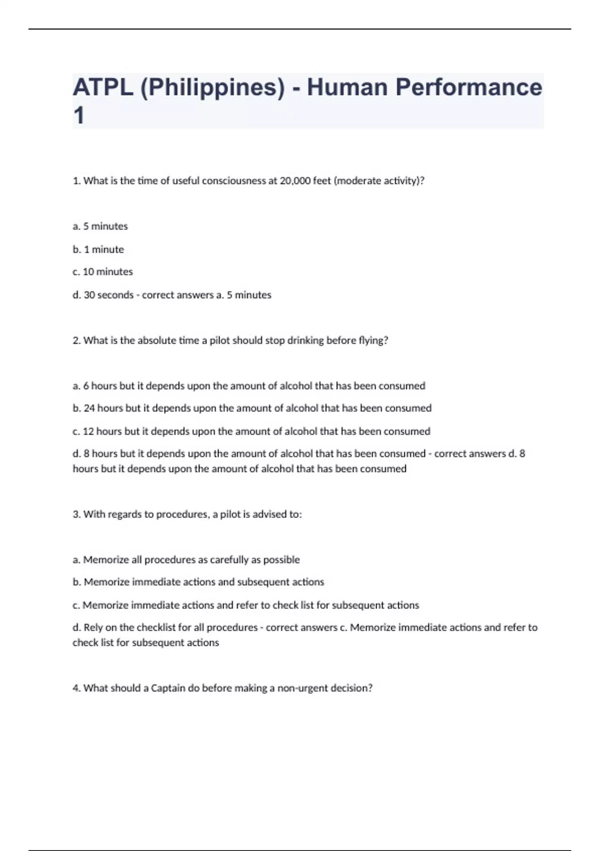 ATPL (Philippines) - Human Performance 11. What is the time of useful consciousness at 20,000 feet (moderate activity)? a. 5 minutes b. 1 minute c. 10 minutes d. 30 seconds - correct answers a. 5 minutes 2. What is the absolute time a pilot should stop drinking before flying? a. 6 hours but it depends upon the amount of alcohol that has been consumed b. 24 hours but it depends upon the amount of alcohol that has been consumed c. 12 hours but it depends upon the amount of alcohol that has been consumed d. 8 hours but it depends upon the amount of alcohol that has been consumed - correct answers d. 8 hours but it depends upon the amount of alcohol that has been consumed 3. With regards to procedures, a pilot is advised to: a. Memorize all procedures as carefully as possible b. Memorize immediate actions and subsequent actions c. Memorize immediate actions and refer to check list for subsequent actions d. Rely on the checklist for all procedures - correct answers c. Memorize immediate actions and refer to check list for subsequent actions 4. What should a Captain do before making a non-urgent decision?