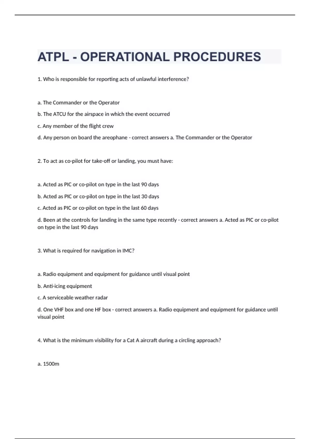 ATPL - OPERATIONAL PROCEDURES 1. Who is responsible for reporting acts of unlawful interference? a. The Commander or the Operator b. The ATCU for the airspace in which the event occurred c. Any member of the flight crew d. Any person on board the areophane - correct answers a. The Commander or the Operator 2. To act as co-pilot for take-off or landing, you must have: a. Acted as PIC or co-pilot on type in the last 90 days b. Acted as PIC or co-pilot on type in the last 30 days c. Acted as PIC or co-pilot on type in the last 60 days d. Been at the controls for landing in the same type recently - correct answers a. Acted as PIC or co-pilot on type in the last 90 days 3. What is required for navigation in IMC? a. Radio equipment and equipment for guidance until visual point b. Anti-icing equipment c. A serviceable weather radar d. One VHF box and one HF box - correct answers a. Radio equipment and equipment for guidance until visual point 4. What is the minimum visibility for a Cat A aircraft during a circling approach? a. 1500m