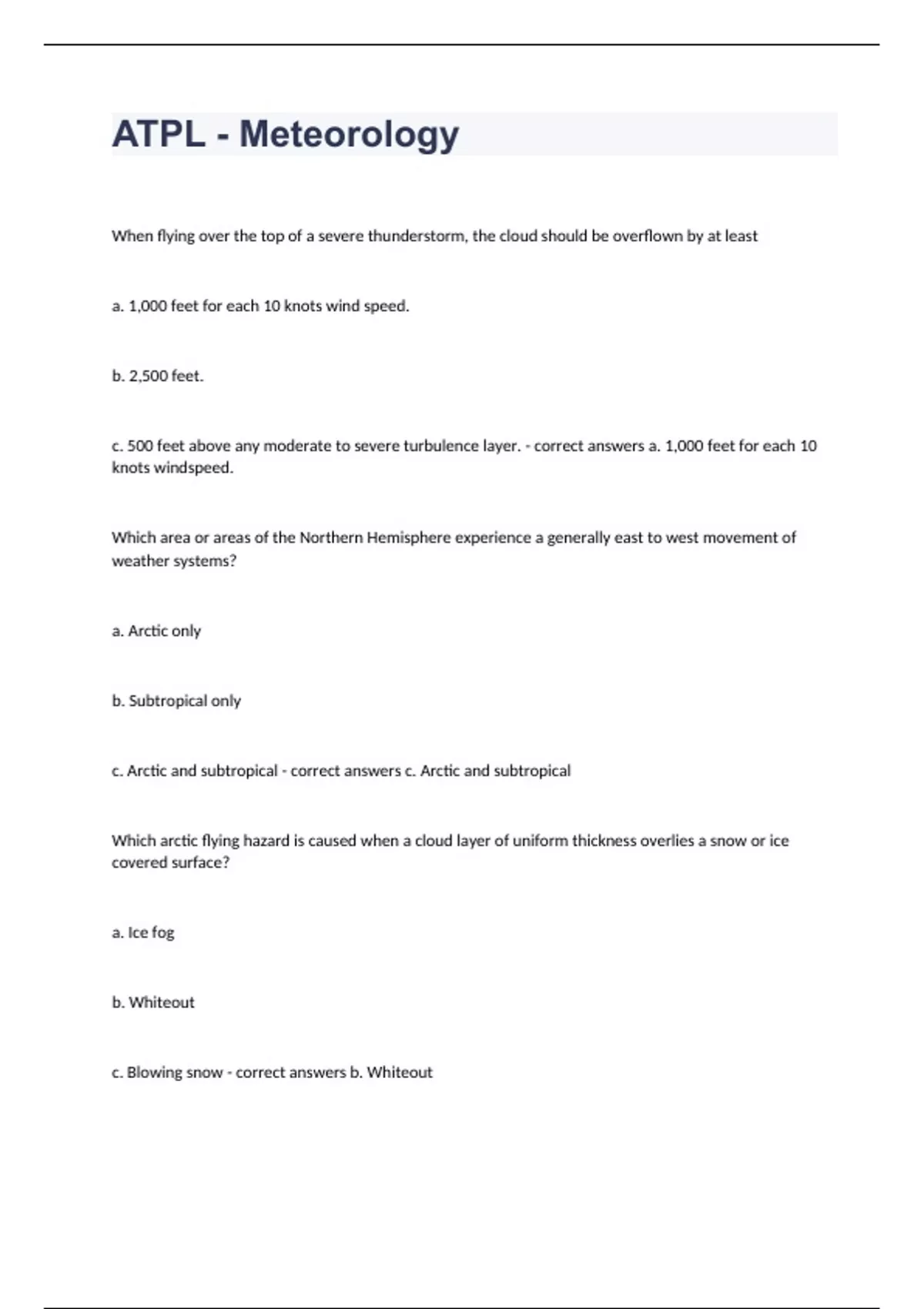 ATPL - MeteorologyWhen flying over the top of a severe thunderstorm, the cloud should be overflown by at least a. 1,000 feet for each 10 knots wind speed. b. 2,500 feet. c. 500 feet above any moderate to severe turbulence layer. - correct answers a. 1,000 feet for each 10 knots windspeed. Which area or areas of the Northern Hemisphere experience a generally east to west movement of weather systems? a. Arctic only b. Subtropical only c. Arctic and subtropical - correct answers c. Arctic and subtropical Which arctic flying hazard is caused when a cloud layer of uniform thickness overlies a snow or ice covered surface? a. Ice fog b. Whiteout c. Blowing snow - correct answers b. Whiteout A clear area in a line of thunderstorm echoes on a radar scope indicates a. the absence of clouds in the area b. an area of no convective turbulence c. an area where precipitation drops are not detected - correct answers c. an area where precipitation drops are not detected [?] Which type of icing is associated with the smallest size of water droplet similar to that found in low-level stratus clouds? a. Clear Ice b. Rime Ice c. Frost Ice - correct answers b. Rime Ice [?] Which term applies when the temperature of the air changes by compression or expansion with no heat added or removed? a. Adiabatic