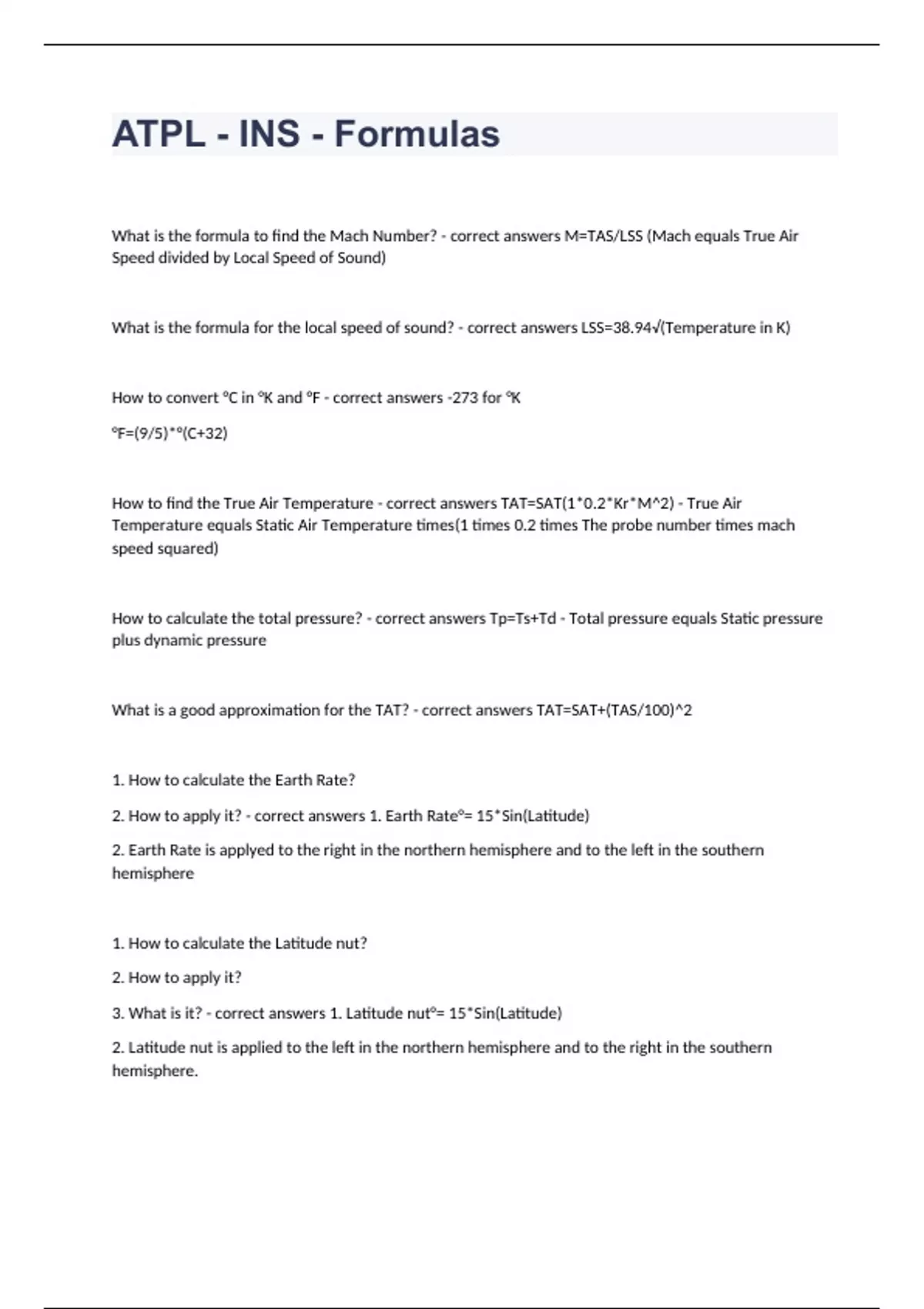 ATPL - INS - Formulas What is the formula to find the Mach Number? - correct answers M=TAS/LSS (Mach equals True Air Speed divided by Local Speed of Sound) What is the formula for the local speed of sound? - correct answers LSS=38.94√(Temperature in K) How to convert °C in °K and °F - correct answers -273 for °K °F=(9/5)*°(C+32) How to find the True Air Temperature - correct answers TAT=SAT(1*0.2*Kr*M^2) - True Air Temperature equals Static Air Temperature times(1 times 0.2 times The probe number times mach speed squared) How to calculate the total pressure? - correct answers Tp=Ts+Td - Total pressure equals Static pressure plus dynamic pressure What is a good approximation for the TAT? - correct answers TAT=SAT+(TAS/100)^2 1. How to calculate the Earth Rate? 2. How to apply it? - correct answers 1. Earth Rate°= 15*Sin(Latitude) 2. Earth Rate is applyed to the right in the northern hemisphere and to the left in the southern hemisphere 1. How to calculate the Latitude nut? 2. How to apply it? 3. What is it? - correct answers 1. Latitude nut°= 15*Sin(Latitude) 2. Latitude nut is applied to the left in the northern hemisphere and to the right in the southern hemisphere.