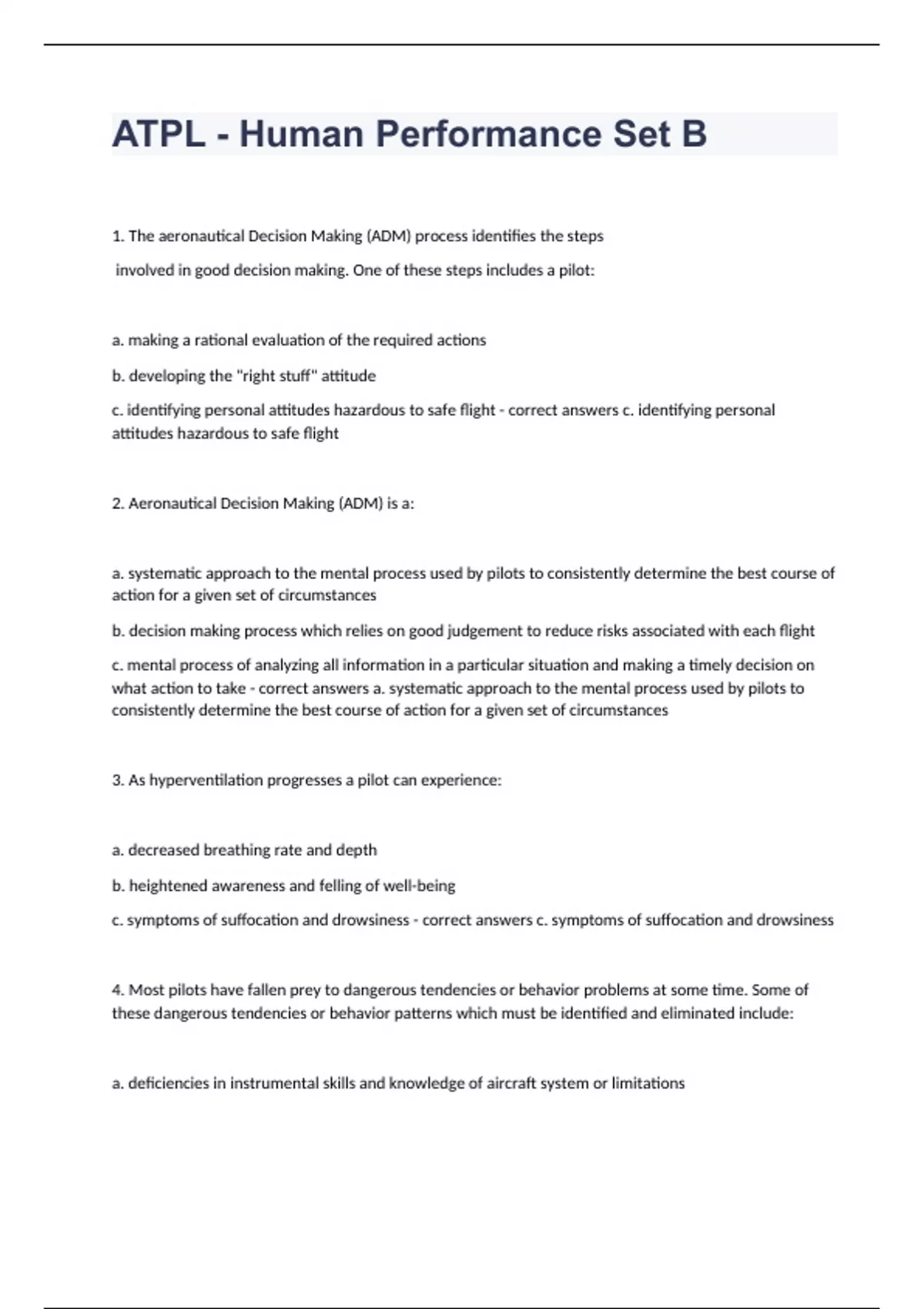 ATPL - Human Performance Set B 1. The aeronautical Decision Making (ADM) process identifies the steps involved in good decision making. One of these steps includes a pilot: a. making a rational evaluation of the required actions b. developing the "right stuff" attitude c. identifying personal attitudes hazardous to safe flight - correct answers c. identifying personal attitudes hazardous to safe flight 2. Aeronautical Decision Making (ADM) is a: a. systematic approach to the mental process used by pilots to consistently determine the best course of action for a given set of circumstances b. decision making process which relies on good judgement to reduce risks associated with each flight c. mental process of analyzing all information in a particular situation and making a timely decision on what action to take - correct answers a. systematic approach to the mental process used by pilots to consistently determine the best course of action for a given set of circumstances 3. As hyperventilation progresses a pilot can experience: a. decreased breathing rate and depth b. heightened awareness and felling of well-being c. symptoms of suffocation and drowsiness - correct answers c. symptoms of suffocation and drowsiness 4. Most pilots have fallen prey to dangerous tendencies or behavior problems at some time. Some of these dangerous tendencies or behavior patterns which must be identified and eliminated include: