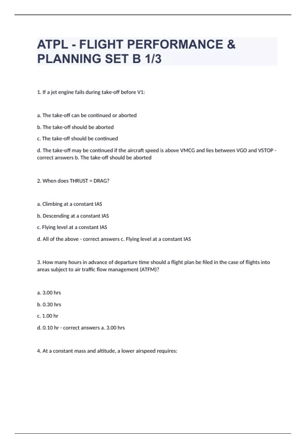 ATPL - FLIGHT PERFORMANCE & PLANNING SET B 1/31. If a jet engine fails during take-off before V1: a. The take-off can be continued or aborted b. The take-off should be aborted c. The take-off should be continued d. The take-off may be continued if the aircraft speed is above VMCG and lies between VGO and VSTOP - correct answers b. The take-off should be aborted 2. When does THRUST = DRAG? a. Climbing at a constant IAS b. Descending at a constant IAS c. Flying level at a constant IAS d. All of the above - correct answers c. Flying level at a constant IAS 3. How many hours in advance of departure time should a flight plan be filed in the case of flights into areas subject to air traffic flow management (ATFM)? a. 3.00 hrs b. 0.30 hrs c. 1.00 hr d. 0.10 hr - correct answers a. 3.00 hrs 4. At a constant mass and altitude, a lower airspeed requires: a. More thrust and a lower coefficient of lift b. Less thrust and a lower coefficient of lift c. More thrust and a lower coefficient of drag d. A higher coefficient of lift - correct answers d. A higher coefficient of lift 5. Which of the following would give the greatest gliding performance? a. Flight at VMD b. Flight at 1.32VMD c. Flight at the best CL/CD ratio d. Flight close to CL MAX - correct answers d. Flight close to CL MAX 6. You make a diversion from the route given in the flight plan and land at an uncontrolled airfield. Within what time after landing should you inform ATC? a. 10 mins b. 20 mins c. 30 mins d. 45 mins - correct answers c. 30 mins 7. After flying for 16 minutes at 100kt TAS with a 20kt tail wind, you have to return to the airfield of departure. You will arrive after: a. 10 min 40 sec b. 20 min c. 24 min d. 16 min - correct answers c. 24 min 8. When approaching a wet runway, with the risk of hydroplaning, what technique should the pilot adapt?