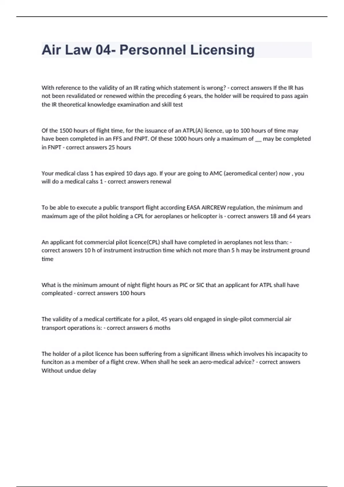 Air Law 04- Personnel LicensingWith reference to the validity of an IR rating which statement is wrong? - correct answers If the IR has not been revalidated or renewed within the preceding 6 years, the holder will be required to pass again the IR theoretical knowledge examination and skill test Of the 1500 hours of flight time, for the issuance of an ATPL(A) licence, up to 100 hours of time may have been completed in an FFS and FNPT. Of these 1000 hours only a maximum of __ may be completed in FNPT - correct answers 25 hours Your medical class 1 has expired 10 days ago. If your are going to AMC (aeromedical center) now , you will do a medical calss 1 - correct answers renewal To be able to execute a public transport flight according EASA AIRCREW regulation, the minimum and maximum age of the pilot holding a CPL for aeroplanes or helicopter is - correct answers 18 and 64 years An applicant fot commercial pilot licence(CPL) shall have completed in aeroplanes not less than: - correct answers 10 h of instrument instruction time which not more than 5 h may be instrument ground time What is the minimum amount of night flight hours as PIC or SIC that an applicant for ATPL shall have compleated - correct answers 100 hours The validity of a medical certificate for a pilot, 45 years old engaged in single-pilot commercial air transport operations is: - correct answers 6 moths The holder of a pilot licence has been suffering from a significant illness which involves his incapacity to funciton as a member of a flight crew. When shall he seek an aero-medical advice? - correct answers Without undue delay