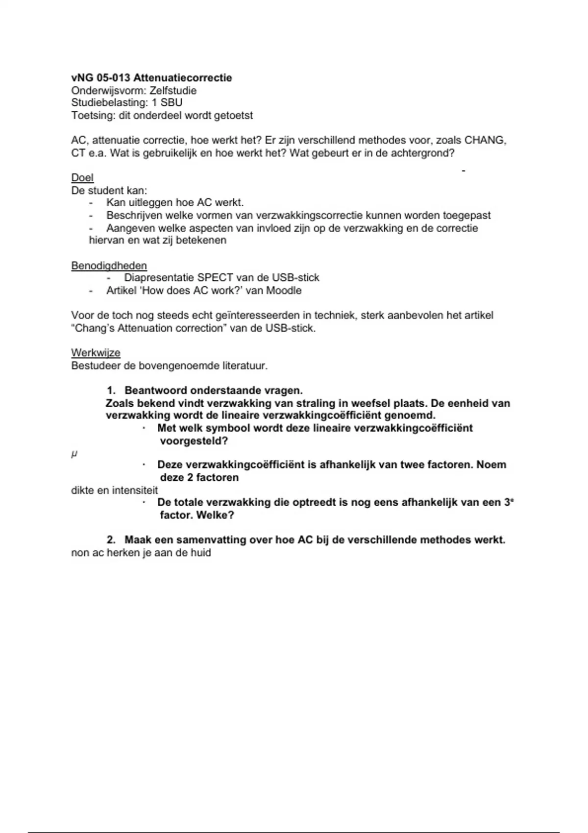 Samenvatting van 1 pagina's voor het vak nucleaire geneeskunde aan de InHolland (Attenuatiecorrectie)