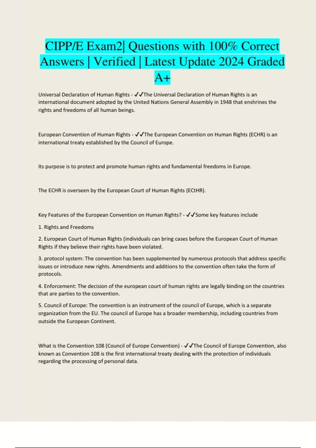 CIPP/E Exam2| Questions with 100% Correct Answers | Verified | Latest Update 2024 Graded A+