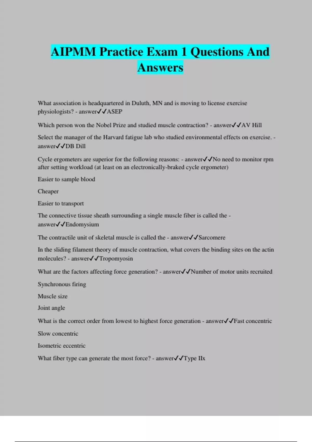 AIPMM Practice Exam 1 Questions And Answers What association is headquartered in Duluth, MN and is moving to license exercise physiologists? - answerASEP Which person won the Nobel Prize and studied muscle contraction? - answerAV Hill Select the manager of the Harvard fatigue lab who studied environmental effects on exercise. - answerDB Dill Cycle ergometers are superior for the following reasons: - answerNo need to monitor rpm after setting workload (at least on an electronically-braked cycle ergometer)