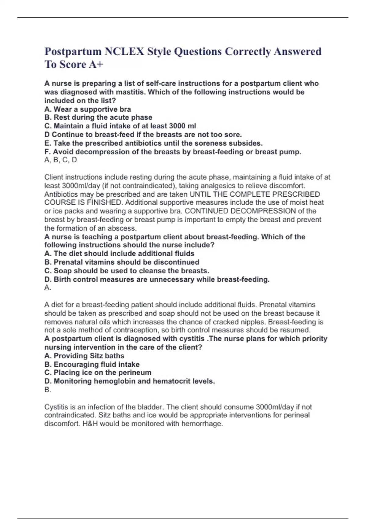 Postpartum NCLEX Style Questions Correctly Answered To Score A+ A nurse is preparing a list of self-care instructions for a postpartum client who was diagnosed with mastitis. Which of the following instructions would be included on the list? A. Wear a supportive bra B. Rest during the acute phase C. Maintain a fluid intake of at least 3000 ml D Continue to breast-feed if the breasts are not too sore. E. Take the prescribed antibiotics until the soreness subsides. F. Avoid decompression of the breasts by breast-feeding or breast pump. A, B, C, D Client instructions include resting during the acute phase, maintaining a fluid intake of at least 3000ml/day (if not contraindicated), taking analgesics to relieve discomfort. Antibiotics may be prescribed and are taken UNTIL THE COMPLETE PRESCRIBED COURSE IS FINISHED. Additional supportive measures include the use of moist heat or ice packs and wearing a supportive bra. CONTINUED DECOMPRESSION of the breast by breast-feeding or breast pump is important to empty the breast and prevent the formation of an abscess. A nurse is teaching a postpartum client about breast-feeding. Which of the following instructions should the nurse include? A. The diet should include additional fluids B. Prenatal vitamins should be discontinued C. Soap should be used to cleanse the breasts. D. Birth control measures are unnecessary while breast-feeding. A. A diet for a breast-feeding patient should include additional fluids. Prenatal vitamins should be taken as prescribed and soap should not be used on the breast because it removes natural oils which increases the chance of cracked nipples. Breast-feeding is not a sole method of contraception, so birth control measures should be resumed. A postpartum client is diagnosed with cystitis .The nurse plans for which priority nursing intervention in the care of the client? A. Providing Sitz baths B. Encouraging fluid intake C. Placing ice on the perineum D. Monitoring hemoglobin and hematocrit levels. B. Cystitis is an infection of the bladder. The client should consume 3000ml/day if not contraindicated. Sitz baths and ice would be appropriate interventions for perineal discomfort. H&H would be monitored with hemorrhage. After a precipitous delivery, a nurse notes that the new mother is passive and only touches her newborn infant briefly with her fingertips. The nurse should do which of the following to help the woman process what has happened? A. Encourage the mother to breast-feed soon after birth. B. Support the mother in her reaction to the newborn infant. C. Tell the mother that it is important to hold the newborn infant. D. Document a complete account of the mother's reaction on the birth record. B. Precipitous labor is labor that lasts less than 3 hours. Women who have experienced precipitous labor often describe the feelings of disbelief that their labor progressed so rapidly. To assist the client to process what has happened the best option is to support the client in her reaction to the newborn infant. Options A, C, and D do not acknowledge the client's feelings. A client who is breast-feeding her newborn infant is experiencing nipple soreness. To relieve the soreness, the nurse suggests that the client: A. Avoid rotating breast-feeding positions. B. Stop nursing until the nipples heal C. Substitute a bottle-feeding until the nipples heal. D. Position the infant with the ear, shoulder, and hip in straight alignment with the infant's stomach against the mother. D. The nurse would suggest the mother position the infant in this manner. Rotating breast-feeding positions; breaking suction with the little finger; nursing frequently; begin feeding on the less sore nipple; not allowing the newborn to chew on the nipple or to sleep holding the nipple in the mouth and applying tea bags soaked in warm water to the nipple are also measures to alleviate nipple soreness. On assessment of a client who is 30 minutes into the fourth stage of labor, the nurse finds the client's perineal pad saturated with blood and blood soaked into the bed linen under the client's buttocks. The nurse's initial action is which of the following. A. Call the physician B. Assess the client's vital signs C. Gently massage the uterine fundus D. Administer a 300ml bolus of a 20 units/L Oxytocin(Pitocin) solution C. The most frequent cause of excessive bleeding or hemorrhage after childbirth is uterine atony. A major intervention to restore adequate tone is stimulation of the uterine muscle via gently massaging the uterine fundus. Options A, B and D may be necessary eventually but are not initial actions. The initial action is to alleviate the problem. A second-day postpartum client with diabetes mellitus has scant lochia with a foul odor and a temperature of 101.6 degrees F. The physician suspects infection and writes orders to treat the client. Which of the following orders written by the physician would the nurse complete first? A. Obtain culture and sensitivity of lochia and urine B. Administer Ceftriaxone (Rocephin) C. Check the client's temperature D. Increase the intake of oral fluids. A. Culture and sensitivity results should be obtained before any antibiotic therapy is begun to avoid masking the microorganisms identified in the culture. Options B and D are standard parts of therapy for this type of infection but are not completed first. Although the client's temperature is monitored, checking the temperature is not the first action.The data in the question indicate that the temperature has already been checked. A nurse assigned to care for a postpartum client plans to promote parental-infant bonding by encouraging the parents to: A. Use a low-pitched voice to speak to the infant B. Allow the nursing staff to assume the infant care during hospitalization so they may rest C. Hold and cuddle the infant closely D. Allow the infant to sleep in the parental bed between the parents C. Holding the infant close so that body warmth can be felt initiates a po