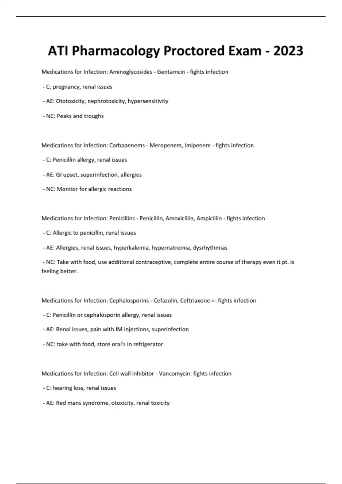 Medications for Infection: Aminoglycosides - Gentamcin - fights infection - C: pregnancy, renal issues - AE: Ototoxicity, nephrotoxicity, hypersensitivity - NC: Peaks and troughs Medications for Infection: Carbapenems - Meropenem, Imipenem - fights infection - C: Penicillin allergy, renal issues - AE: GI upset, superinfection, allergies - NC: Monitor for allergic reactions Medications for Infection: Penicillins - Penicillin, Amoxicillin, Ampicillin - fights infection - C: Allergic to penicillin, renal issues - AE: Allergies, renal issues, hyperkalemia, hypernatremia, dysrhythmias - NC: Take with food, use additional contraceptive, complete entire course of therapy even it pt. is feeling better. Medications for Infection: Cephalosporins - Cefazolin, Ceftriaxone =- fights infection - C: Penicillin or cephalosporin allergy, renal issues - AE: Renal issues, pain with IM injections, superinfection - NC: take with food, store oral's in refrigerator Medications for Infection: Cell wall inhibitor - Vancomycin: fights infection - C: hearing loss, renal issues - AE: Red mans syndrome, otoxicity, renal toxicity - NC: Give slowly over 60 mins IV to help prevent red mans syndrome, complete entire course of therapy even it pt. is feeling better. Medications for Infection: Tetracyclines - Doxycycline: fights infection, acne, lyme disease - C: pregnancy, liver/kidney disease - AE: If given to children <8 - causes tooth discoloration, photosensitivity, GI upset, superinfection - NC: use additional contraceptive, complete entire course of therapy even it pt. is feeling better. Medications for Infection: Macrolides - Erythromycin, Azithromycin (z-pak) - fights infections, pneumonia, pertussis, chlamydia (is an alt. med. for those who are allergic to penicillin) - C: Liver disease, prolonged QT - AE: GI upset, ototoxicity, prolonged QT - NC: Use additional contraceptive, if treating an STD - treat partner as well. Medications for Infection: Sulfonamides & Trimethoprim - Trimethoprim-silfamethoxazole - treats UTI's - C: Pregnancy/lactation, folate deficiency, renal issues - AE: Agranulocytosis, hyperkalemia, hypersensitivity - NC: Take on an empty stomach! Use additional contraceptive, complete entire course of therapy even it pt. is feeling better. Medications for Infection: Urinary tract antiseptic - Nitrofurantoin: treats UTI's - C: pregnancy/lactation, renal issues - AE: GI upset, peripheral neuropathy - NC: turns urine rust-yellow to brown, can stain teeth, complete entire course of therapy even it pt. is feeling better. Medications for Infection: Fluoroquinolones - Ciprofloxacin - fights infection - C: Can cause spontaneous tendon rupture in children <18, pregnancy/lactation - AE: GI upset, tendon rupture, superinfection, phototoxicity - NC: Low doses in pt's with renal impairment, complete entire course of therapy even it pt. is feeling better.