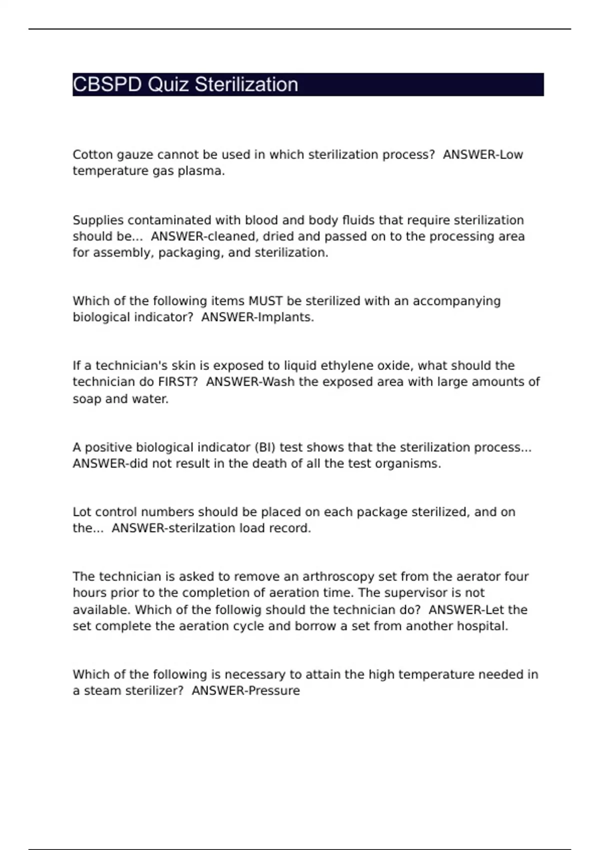 CBSPD Quiz Decontamination and Disinfection|Questions with 100% Correct Answers | Verified | Updated 2024