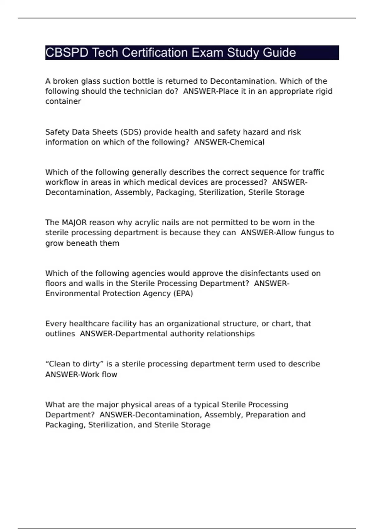 A broken glass suction bottle is returned to Decontamination. Which of the following should the technician do? ANSWER-Place it in an appropriate rigid container Safety Data Sheets (SDS) provide health and safety hazard and risk information on which of the following? ANSWER-Chemical