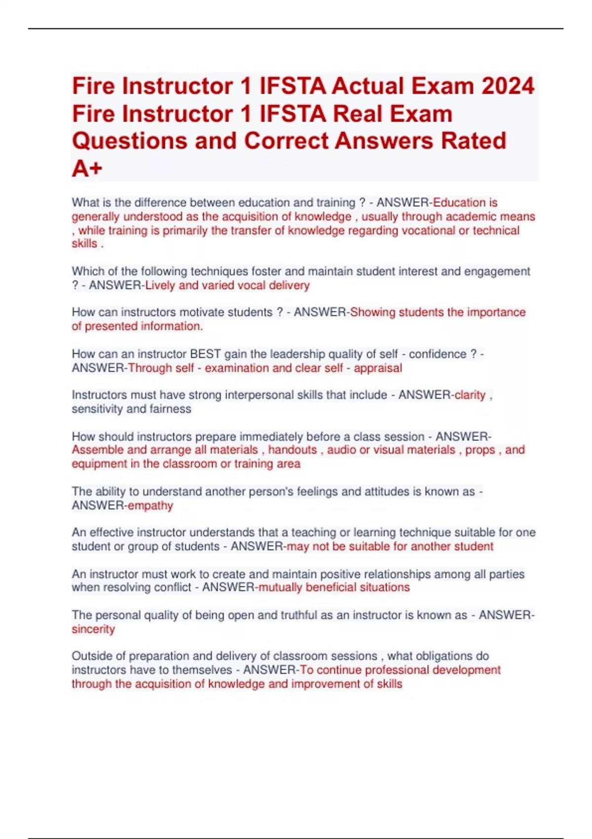 Fire Instructor 1 IFSTA Actual Exam 2024 Fire Instructor 1 IFSTA Real Exam Questions and Correct Answers Rated A+