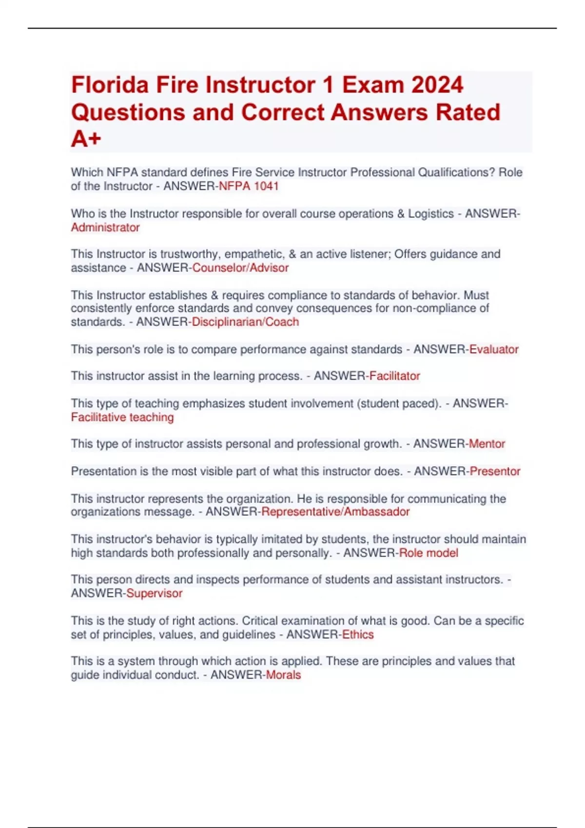 Florida Fire Instructor 1 Exam 2024 Questions and Correct Answers Rated A+