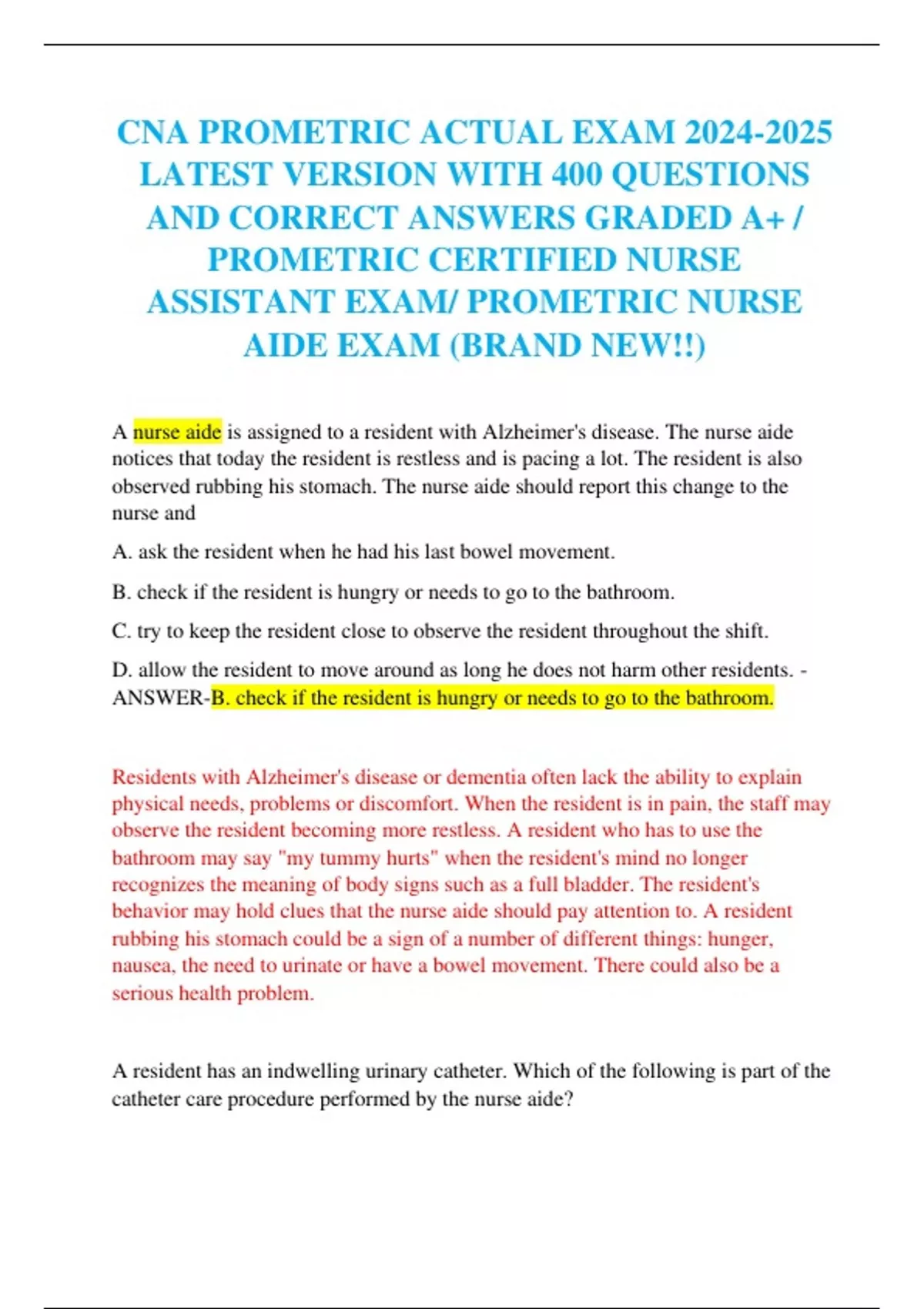 CNA PROMETRIC ACTUAL EXAM LATEST VERSION WITH 400 QUESTIONS AND CORRECT ANSWERS GRADED A+ / PROMETRIC CERTIFIED NURSE ASSISTANT EXAM/ PROMETRIC NURSE AIDE EXAM (BRAND NEW!!) A nurse aide is assigned to a resident with Alzheimer's disease. The nurse aide notices that today the resident is restless and is pacing a lot. The resident is also observed rubbing his stomach. The nurse aide should report this change to the nurse and A. ask the resident when he had his last bowel movement. B. check if the resident is hungry or needs to go to the bathroom. C. try to keep the resident close to observe the resident throughout the shift. D. allow the resident to move around as long he does not harm other residents. - ANSWER-B. check if the resident is hungry or needs to go to the bathroom. Residents with Alzheimer's disease or dementia often lack the ability to explain physical needs, problems or discomfort. When the resident is in pain, the staff may observe the resident becoming more restless. A resident who has to use the bathroom may say "my tummy hurts" when the resident's mind no longer recognizes the meaning of body signs such as a full bladder. The resident's behavior may hold clues that the nurse aide should pay attention to. A resident rubbing his stomach could be a sign of a number of different things: hunger, nausea, the need to urinate or have a bowel movement. There could also be a serious health problem.