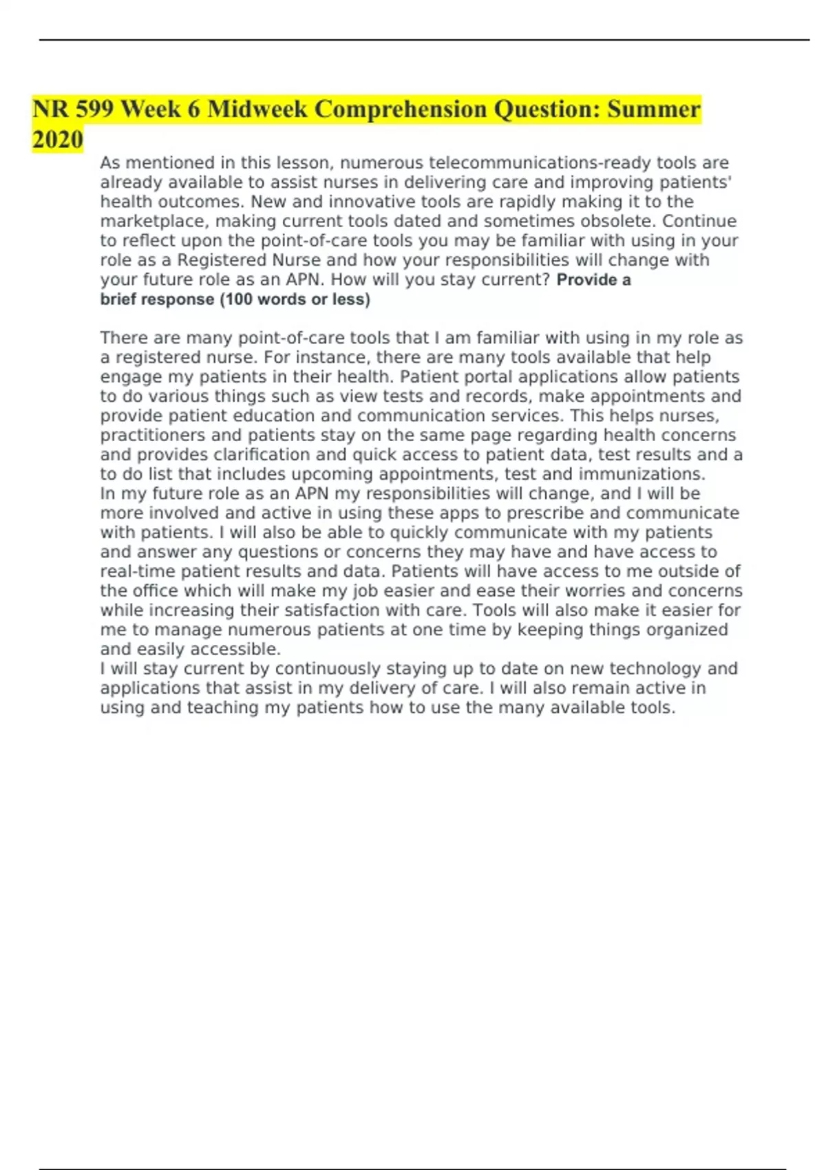 NR 599 Week 6 Midweek Comprehension Question: Summer 2020 As mentioned in this lesson, numerous telecommunications-ready tools are already available to assist nurses in delivering care and improving patients' health outcomes. New and innovative tools are rapidly making it to the marketplace, making current tools dated and sometimes obsolete. Continue to reflect upon the point-of-care tools you may be familiar with using in your role as a Registered Nurse and how your responsibilities will change with your future role as an APN. How will you stay current? Provide a brief response (100 words or less) There are many point-of-care tools that I am familiar with using in my role as a registered nurse. For instance, there are many tools available that help engage my patients in their health. Patient portal applications allow patients to do various things such as view tests and records, make appointments and provide patient education and communication services. This helps nurses, practitioners and patients stay on the same page regarding health concerns and provides clarification and quick access to patient data, test results and a to do list that includes upcoming appointments, test and immunizations. In my future role as an APN my responsibilities will change, and I will be more involved and active in using these apps to prescribe and communicate with patients. I will also be able to quickly communicate with my patients and answer any questions or concerns they may have and have access to real-time patient results and data. Patients will have access to me outside of the office which will make my job easier and ease their worries and concerns while increasing their satisfaction with care. Tools will also make it easier for me to manage numerous patients at one time by keeping things organized and easily accessible. I will stay current by continuously staying up to date on new technology and applications that assist in my delivery of care. I will also remain active in using and teaching my patients how to use the many available tools.