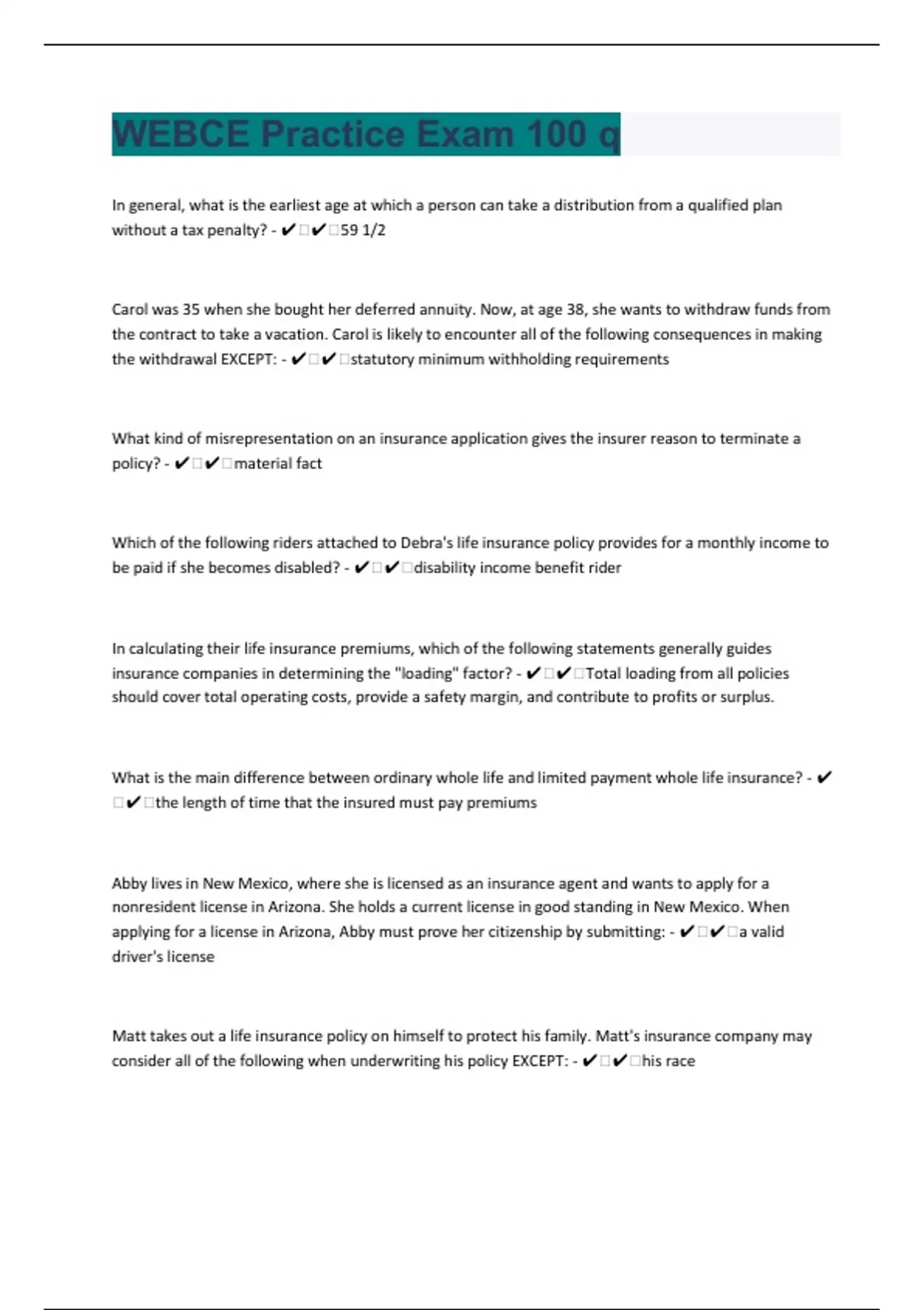 In general, what is the earliest age at which a person can take a distribution from a qualified plan without a tax penalty? - ️️59 1/2 Carol was 35 when she bought her deferred annuity. Now, at age 38, she wants to withdraw funds from the contract to take a vacation. Carol is likely to encounter all of the following consequences in making the withdrawal EXCEPT: - ️️statutory minimum withholding requirements What kind of misrepresentation on an insurance application gives the insurer reason to terminate a policy? - ️️material fact Which of the following riders attached to Debra's life insurance policy provides for a monthly income to be paid if she becomes disabled? - ️️disability income benefit rider In calculating their life insurance premiums, which of the following statements generally guides insurance companies in determining the "loading" factor? - ️️Total loading from all policies should cover total operating costs, provide a safety margin, and contribute to profits or surplus. What is the main difference between ordinary whole life and limited payment whole life insurance? - ️️the length of time that the insured must pay premiums Abby lives in New Mexico, where she is licensed as an insurance agent and wants to apply for a nonresident license in Arizona. She holds a current license in good standing in New Mexico. When applying for a license in Arizona, Abby must prove her citizenship by submitting: - ️️a valid driver's license Matt takes out a life insurance policy on himself to protect his family. Matt's insurance company may consider all of the following when underwriting his policy EXCEPT: - ️️his race
