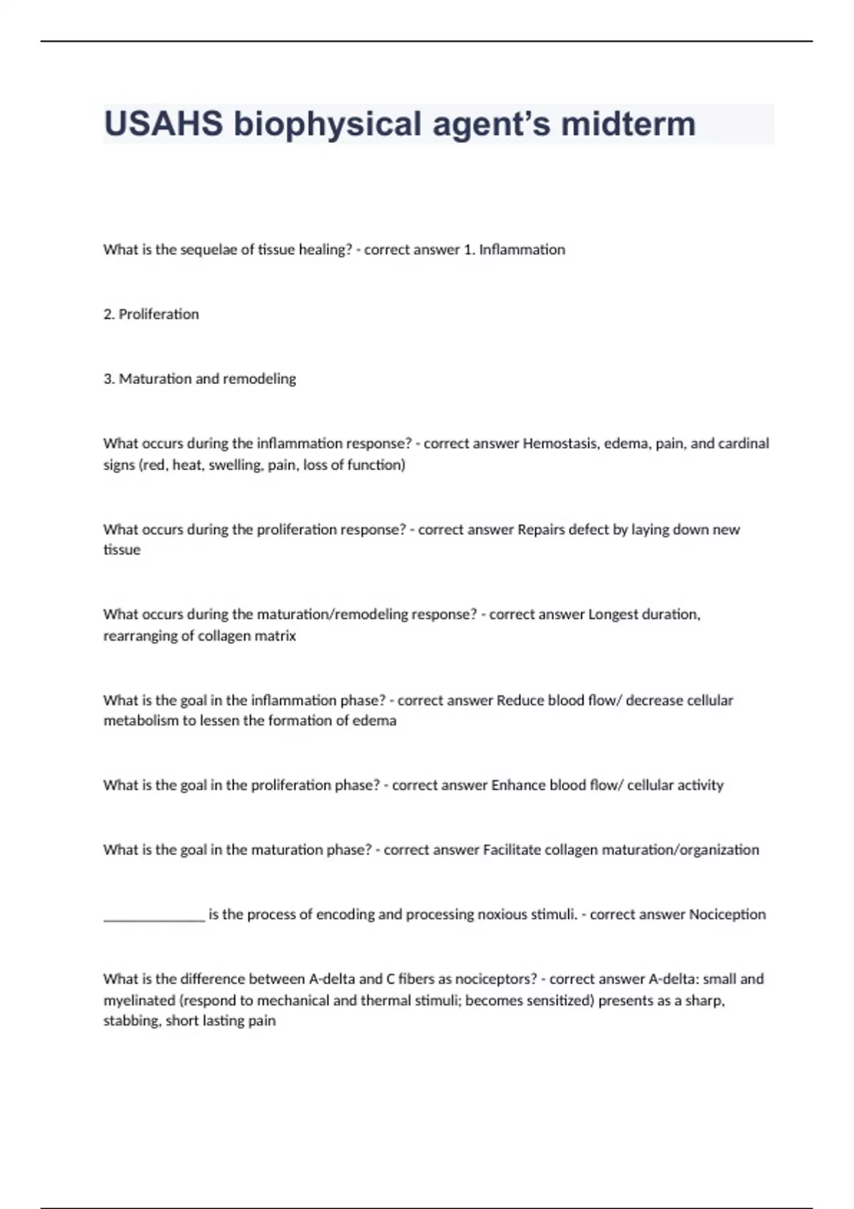 USAHS biophysical agent’s midtermWhat is the sequelae of tissue healing? - correct answer 1. Inflammation 2. Proliferation 3. Maturation and remodeling What occurs during the inflammation response? - correct answer Hemostasis, edema, pain, and cardinal signs (red, heat, swelling, pain, loss of function) What occurs during the proliferation response? - correct answer Repairs defect by laying down new tissue What occurs during the maturation/remodeling response? - correct answer Longest duration, rearranging of collagen matrix What is the goal in the inflammation phase? - correct answer Reduce blood flow/ decrease cellular metabolism to lessen the formation of edema What is the goal in the proliferation phase? - correct answer Enhance blood flow/ cellular activity What is the goal in the maturation phase? - correct answer Facilitate collagen maturation/organization _____________ is the process of encoding and processing noxious stimuli. - correct answer Nociception What is the difference between A-delta and C fibers as nociceptors? - correct answer A-delta: small and myelinated (respond to mechanical and thermal stimuli; becomes sensitized) presents as a sharp, stabbing, short lasting pain