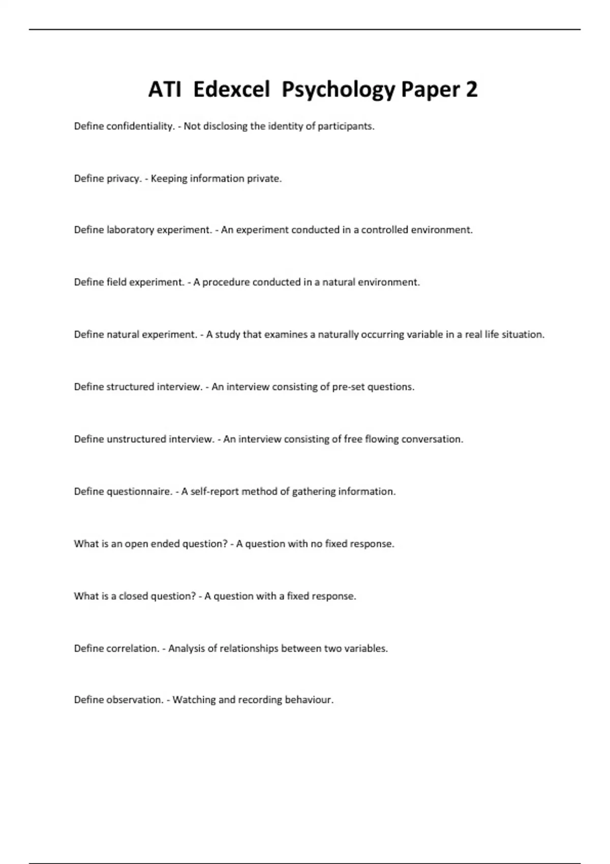 Define confidentiality. - Not disclosing the identity of participants. Define privacy. - Keeping information private. Define laboratory experiment. - An experiment conducted in a controlled environment. Define field experiment. - A procedure conducted in a natural environment. Define natural experiment. - A study that examines a naturally occurring variable in a real life situation. Define structured interview. - An interview consisting of pre-set questions. Define unstructured interview. - An interview consisting of free flowing conversation. Define questionnaire. - A self-report method of gathering information. What is an open ended question? - A question with no fixed response. What is a closed question? - A question with a fixed response. Define correlation. - Analysis of relationships between two variables. Define observation. - Watching and recording behaviour. Define natural observation. - Behaviour observed in a natural environment. Define controlled observation. - Behaviour observed in a lab or controlled environment. Define overt observation. - Participants know that they are being observed. Define covert observation. - Participants are unaware that they are being observed. Define participant observation. - The observer is involved in the group. Define non-participant observation. - The observer watches without being involved in the group. Define normal distribution. - All averages are very similar. Define skewed distribution. - The median or mode differ from the mean. Define frequency scores. - The number of times a score is found in a data set. Define primary data. - Data collected directly for a specific research purpose. Define secondary data. - Data used in a study that has already been collected. Define meta-analysis. - Merging lots of data together to form conclusions. Define qualitative data. - Descriptive data.