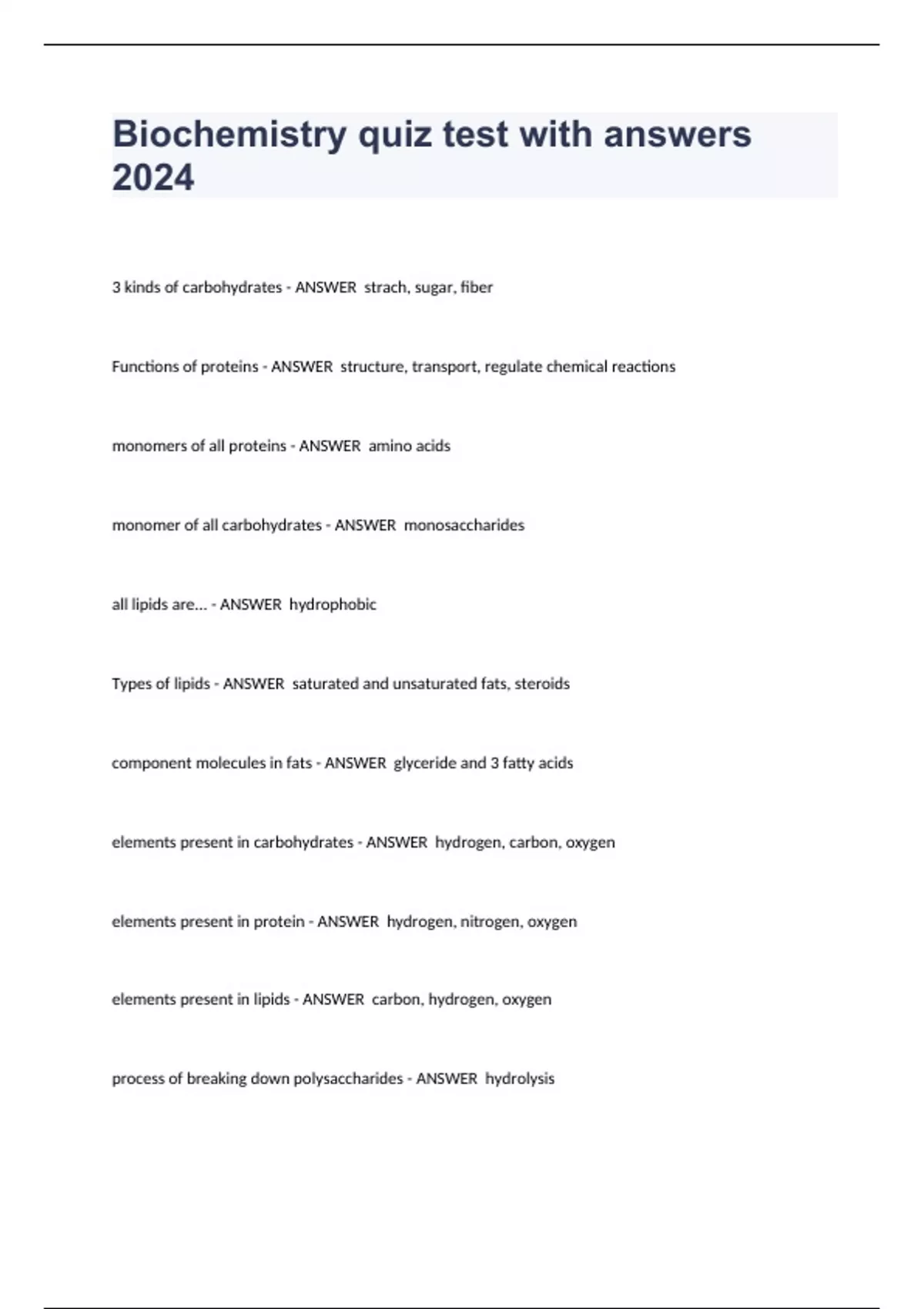Biochemistry quiz test with answers 2024 3 kinds of carbohydrates strach, sugar, fiber Functions of proteins structure, transport, regulate chemical reactions monomers of all proteins amino acids monomer of all carbohydrates monosaccharides all lipids are... hydrophobic