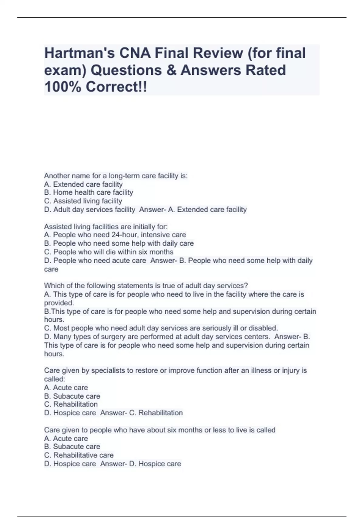 Hartman's CNA Final Review (for final exam) Questions & Answers Rated 100% Correct!!.