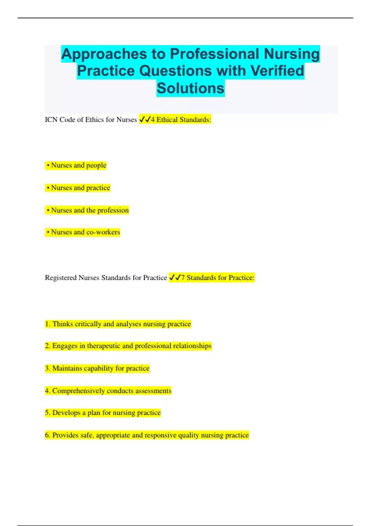 Approaches to Professional Nursing Practice Questions with Verified Solutions ICN Code of Ethics for Nurses 4 Ethical Standards: • Nurses and people • Nurses and practice • Nurses and the profession • Nurses and co-workers Registered Nurses Standards for Practice 7 Standards for Practice: 1. Thinks critically and analyses nursing practice 2. Engages in therapeutic and professional relationships 3. Maintains capability for practice 4. Comprehensively conducts assessments 5. Develops a plan for nursing practice 6. Provides safe, appropriate and responsive quality nursing practice 7. Evaluates outcomes to inform nursing practice Code of Professional Conduct for Nurses 10 Conduct Statements: 1. Nurses practice in a safe and competent manner 2. Nurses practice in accordance with the standards of the profession and broader health system 3. Nurses practice and conduct themselves in accordance with laws relevant to the profession and practice of nursing 4. Nurses respect the dignity, cutlture, ethnicity, values and beliefs of people receiving care and treatment and their colleagues 5. Nurses treat personal information obtained in a professional capacity as well as private and confidential 6. Nurses provide impartial, honest and accurate information in relation to nursing care and health care products 7. Nurse support the health, wellbeing and informed decision making of people requiring and receving care 8. Nurses promote and preserve the trust and privilege inherent in the relationship between nurses and the person receiving care 9. Nurses maintain and build on the community's trust and confidence in the nursing profession 10. Nurses practice nursing reflectively and ethically Nurses Guide to Professional Boundaries 3 Zones: 1. Disinterested Neglectful: Under involvement 2. Therapeutic Relationship: Zone of helpfulness 3. Boundary Violations: Overinvolvement ACSQHC National Safety and Quality Health Service Standards 8 Standards: 1. Clinical Governance 2. Partnering with Consumers 3. Preventing and Controlling HAI 4. Medication Safety 5. Comprehensive Care 6. Communicating for Safety 7. Blood Management 8. Recognising and Responding to Acute Deterioration Role of AHPRA Australian Health Practitioner Regulation Authority Role of NMBA - Registering nursing and midwifery practitioners and students - Developing standards, codes and guidelines for the nursing and midwifery profession - Handling notifications, complaints, investigations and disciplinary hearings - Assessing overseas trained practitioners who wish to practise in Australia - Approving accreditation standards and accredited courses of study NATIONAL REGISTRATION FOR NURSES AND MIWIVES INTRODUCED 2010 Role of Nursing Tribunal 1. Protect health and safety of general public by minimising recurrance of risk and deterring instances of simialr conduct by other practictioners 2. Educative to practitioners about