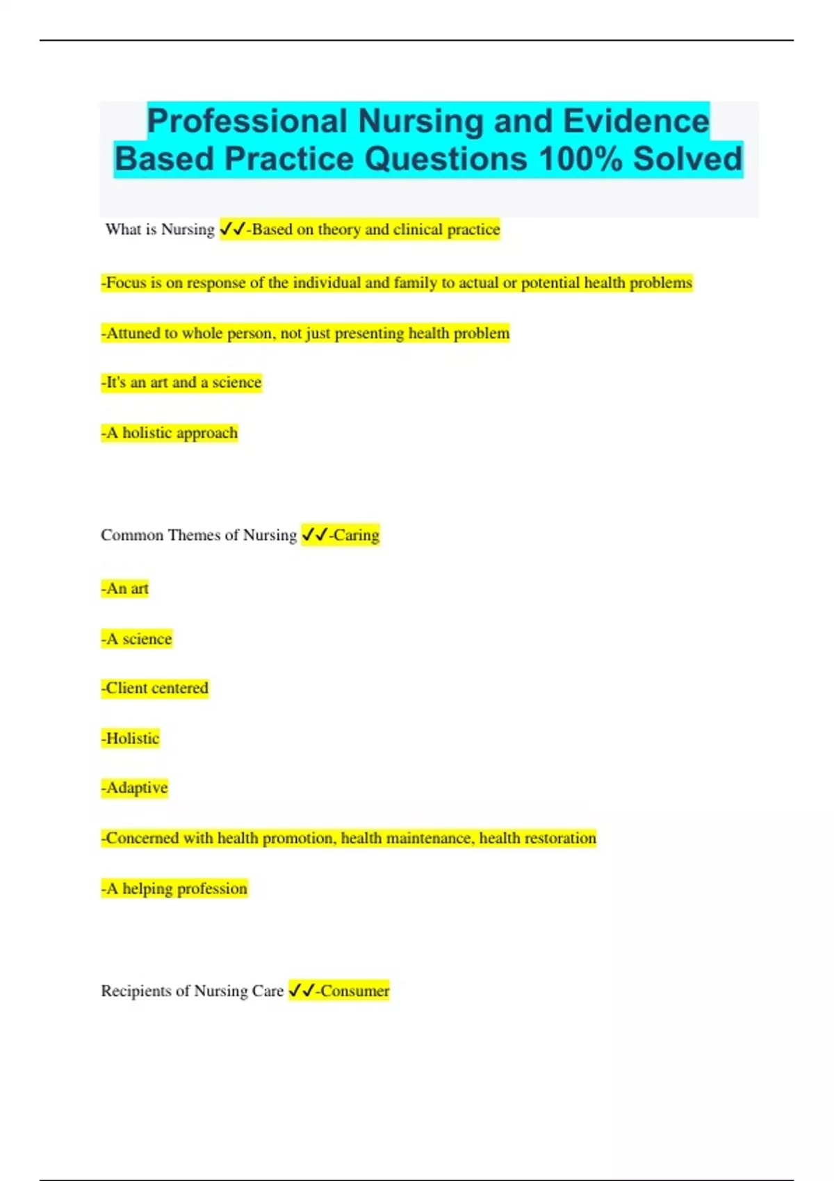 Professional Nursing and Evidence Based Practice Questions 100% Solved What is Nursing -Based on theory and clinical practice -Focus is on response of the individual and family to actual or potential health problems -Attuned to whole person, not just presenting health problem -It's an art and a science -A holistic approach Common Themes of Nursing -Caring -An art -A science -Client centered -Holistic -Adaptive -Concerned with health promotion, health maintenance, health restoration -A helping profession Recipients of Nursing Care -Consumer -Patient -Client Consumer Healthcare can be offered to one person or a group Patient Comes from latin word meaning to suffer. A passive person Client An active recipient of healthcare. *preferred term* Scope of Nursing -Promoting health and wellness -Preventing illness -Restoring health -Caring for the dying Practice settings for nursing -Acute care hospitals -Home care -Community agencies -Ambulatory clinics -Health maintenance organizations -Nursing practice centers Nurse practice acts (indvidual to each state) -Legal acts that regulate the practice of nursing in the US and Canada -Each state has its own -Purpose: To protect the public -Nurses are responsible for knowing and complying with their states practice act as it governs their practice Standards of Nursing Practice ANA -Describe responsibilities for which nurses are accountable -Generic; use it to establish a foundation -Provide for practice of nursing regardless of area of specialization -Specialty organizations may develop specific standards for their area NOT OPEN TO NEGOTIATION AND ALWAYS OVERRIDE INSTITUTIONAL POLICIES Standard 1:Professionalism Assessment -The nurse collects patient health date Standard 2: Professionalism Diagnosis -The nurse analyzes the assessment date in determining diagnosis Standard 3: Professionalism Outcome Identification -The nurse identifies expected outcomes individualized to the patient Standard 4: Professionalism Planning -The nurse develops a plan of care that prescribes interventions to attain expected outcomes Standard 5: Professionalism Implementation -The nurse implements the interventions identified in the plan Standard 6: Professionalism Evaluation -The nurse evaluates the patients progress toward attainment of outcomes Standard 1: Performance Quality of Care -The nurse systematically evaluates the quality and effectiveness of nursing practice Standard 2: Performance Performance Appraisal -The nurse evaluates ones own nursing practice in relation to professional standards and relevant statues and regulations Standard 3: Performance Education -The nurse acquires and maintains current knowledge in nursing practice Standard 4: Performance Collegiality - The nurse interacts with and contributes to the professional development of peers and other health care providers Standard 5: Performance Ethics -The nurses decisions and actions on behalf of patients are determined in an ethical manner. Standard 6: Performance Collaboration -The nurse collaborates with the patient family and other health care providers in providing patient care Standard 7: Performance Research -The nurse uses research findings in practice Standard 8: Performance Resource Utilization -The nurse considers factors related to safety effectiveness and const in planning and delivering patient care. Nursing as a profession is distinguished by: -Prolonged specialized training to acquire body of knowledge pertinent to role -Orientation of individual towards service -Ongoing research -Code of ethics -Autonomy -Professional organization Roles of nursing -Caregiver -Teacher -Communicator -Client advocate -Counselor -Change agent -Leader -Manager Sources of Nursing Knowledge -Tradition: passed from generation to generation -Authoritative: from experts -Clinical experience -Trial and error -Intuition -Logical reasoning -Scientific: research Evidence based Practice -Decreases the uncertainty that clinicians and patients experience -Produces better outcomes and higher levels of satisfaction -Process by which nurses make click decisions using the best available research evidence, their clinical expertise and patient preferences -It is a 3 in 1 approach Why evidence based practice? -Issues in healthcare delivery -practice variation - system issues -Decrease adverse events -Improvement in patient outcomes -Improve practice cultures -Nursing care is not centered on diagnosis, but a clients response to an illness 5 steps of evidence based practice 1. Ask a burning clinical question 2. Collect the most relevant and best evidence 3. Critically appraise the evidence 4. Integrate all evidence with ones clinical expertise, patient preferences, and values in making a practice decision or change 5. Evaluate the practice decision or change The Iowa Model of EBP: Identifying a trigger -Problem focused or knowledge focused -Is the problem a priority? If yes, -Form a team -Write the question (PICO) -Review and critique relevant literature How to make a PICO question P- the patient population I-the potential issue or intervention to be placed C- the comparison of interest O- the desired outcome Levels of Evidence 1 is the strongest 5 is the weakest The Iowa Model of EBP: Piloting The Change in Practice -If there is evidence to make a change in practice, pilot change -select outcomes to be achieved -Collect baseline data -Design evidence based practice guideline -Implement EBP on pilot units -Evaluate process and outcomes -Modify practice guideline in accordance with results The Iowa Model of EBP: is change appropriate? Yes; institute the change in process No; continue to evaluate quality of care and new knowledge