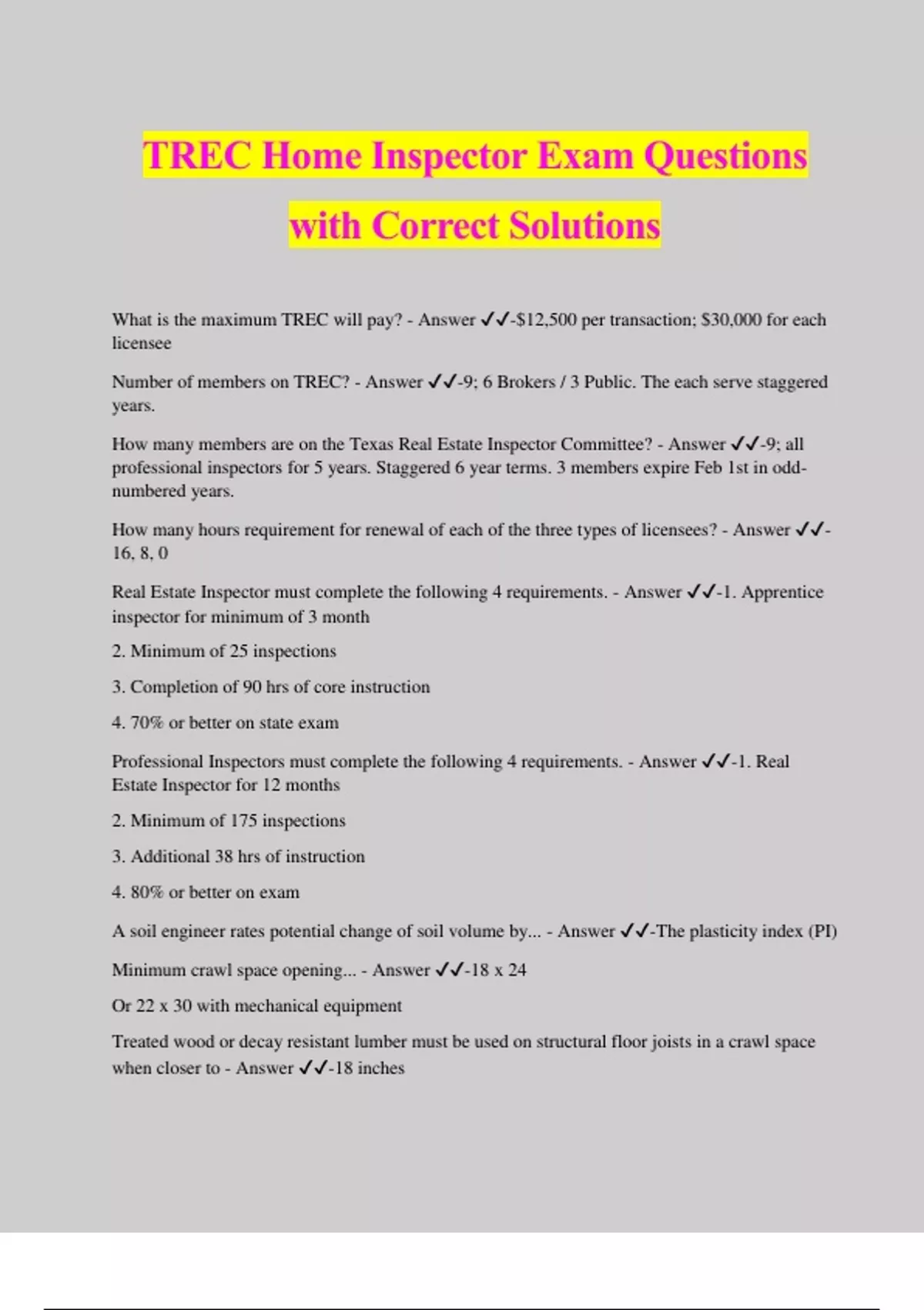 TREC Home Inspector Exam Questions with Correct Solutions What is the maximum TREC will pay? - Answer ️️ -$12,500 per transaction; $30,000 for each licensee Number of members on TREC? - Answer ️️ -9; 6 Brokers / 3 Public. The each serve staggered years. How many members are on the Texas Real Estate Inspector Committee? - Answer ️️ -9; all professional inspectors for 5 years. Staggered 6 year terms. 3 members expire Feb 1st in odd- numbered years. How many hours requirement for renewal of each of the three types of licensees? - Answer ️️ - 16, 8, 0 Real Estate Inspector must complete the following 4 requirements. - Answer ️️ -1. Apprentice inspector for minimum of 3 month 2. Minimum of 25 inspections 3. Completion of 90 hrs of core instruction 4. 70% or better on state exam Professional Inspectors must complete the following 4 requirements. - Answer ️️ -1. Real Estate Inspector for 12 months 2. Minimum of 175 inspections 3. Additional 38 hrs of instruction 4. 80% or better on exam A soil engineer rates potential change of soil volume by... - Answer ️️ -The plasticity index (PI) Minimum crawl space opening... - Answer ️️ -18 x 24 Or 22 x 30 with mechanical equipment Treated wood or decay resistant lumber must be used on structural floor joists in a crawl space when closer to - Answer ️️ -18 inches Structural girders in a crawl space must be made out of treated or decay resistant lumber when closer than ____ to the ground? - Answer ️️ -12 inches Sills or plates which rest on concrete or masonry walls less than ____ above grade must use treated or decay resistant lumber. - Answer ️️ -8 inches Where should anchor bolts be located? - Answer ️️ -Within 12 inches of openings and 6 ft OC thereafter In areas of expansive soils drainage from the roof to the ground surface must be at least ____ from the foundation walls if an approved drainage system is not used. - Answer ️️ -5 ft The maximum that a load bearing wall stud should be cut or notched is ____ ? - Answer ️️ - 25%