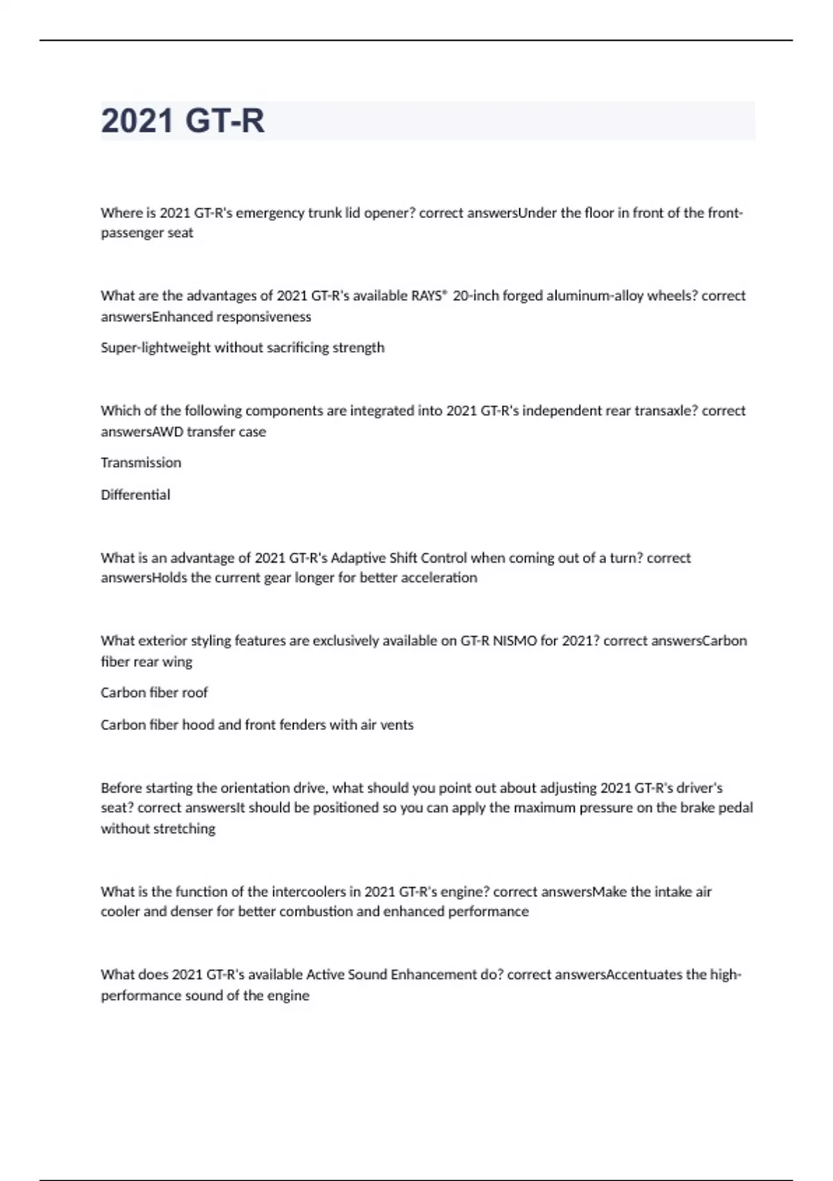 Where is 2021 GT-R's emergency trunk lid opener? correct answersUnder the floor in front of the front-passenger seat What are the advantages of 2021 GT-R's available RAYS® 20-inch forged aluminum-alloy wheels? correct answersEnhanced responsiveness Super-lightweight without sacrificing strength Which of the following components are integrated into 2021 GT-R's independent rear transaxle? correct answersAWD transfer case Transmission Differential What is an advantage of 2021 GT-R's Adaptive Shift Control when coming out of a turn? correct answersHolds the current gear longer for better acceleration What exterior styling features are exclusively available on GT-R NISMO for 2021? correct answersCarbon fiber rear wing Carbon fiber roof Carbon fiber hood and front fenders with air vents Before starting the orientation drive, what should you point out about adjusting 2021 GT-R's driver's seat? correct answersIt should be positioned so you can apply the maximum pressure on the brake pedal without stretching What is the function of the intercoolers in 2021 GT-R's engine? correct answersMake the intake air cooler and denser for better combustion and enhanced performance What does 2021 GT-R's available Active Sound Enhancement do? correct answersAccentuates the high-performance sound of the engine