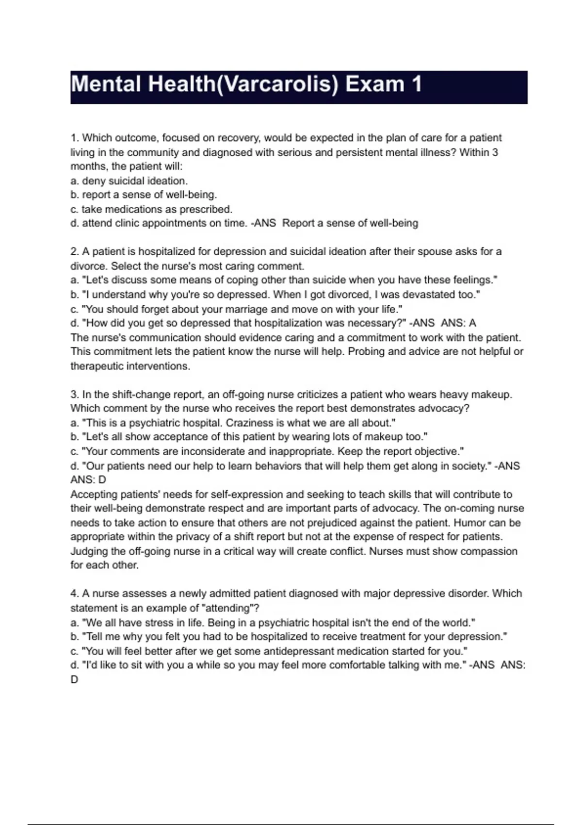 Mental Health(Varcarolis) Exam 1 with CORRECT SOLUTIONS 1. Which outcome, focused on recovery, would be expected in the plan of care for a patient living in the community and diagnosed with serious and persistent mental illness? Within 3 months, the patient will: a. deny suicidal ideation. b. report a sense of well-being. c. take medications as prescribed. d. attend clinic appointments on time. -ANS Report a sense of well-being 2. A patient is hospitalized for depression and suicidal ideation after their spouse asks for a divorce. Select the nurse's most caring comment. a. "Let's discuss some means of coping other than suicide when you have these feelings." b. "I understand why you're so depressed. When I got divorced, I was devastated too." c. "You should forget about your marriage and move on with your life." d. "How did you get so depressed that hospitalization was necessary?" -ANS ANS: A The nurse's communication should evidence caring and a commitment to work with the patient. This commitment lets the patient know the nurse will help. Probing and advice are not helpful or therapeutic interventions. 3. In the shift-change report, an off-going nurse criticizes a patient who wears heavy makeup. Which comment by the nurse who receives the report best demonstrates advocacy? a. "This is a psychiatric hospital. Craziness is what we are all about." b. "Let's all show acceptance of this patient by wearing lots of makeup too." c. "Your comments are inconsiderate and inappropriate. Keep the report objective." d. "Our patients need our help to learn behaviors that will help them get along in society." -ANS ANS: D Accepting patients' needs for self-expression and seeking to teach skills that will contribute to their well-being demonstrate respect and are important parts of advocacy. The on-coming nurse needs to take action to ensure that others are not prejudiced against the patient. Humor can be appropriate within the privacy of a shift report but not at the expense of respect for patients. Judging the off-going nurse in a critical way will create conflict. Nurses must show compassion for each other.